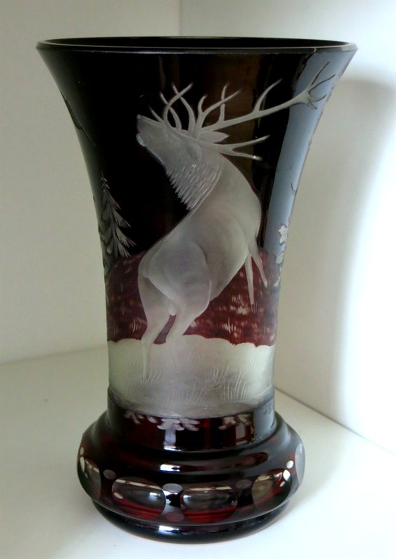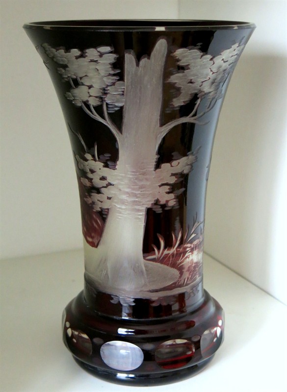 Hluboce leptaná a broušená luxusní váza. Výška 25cm. Signatura nenalezena. Nepoškozeno.
