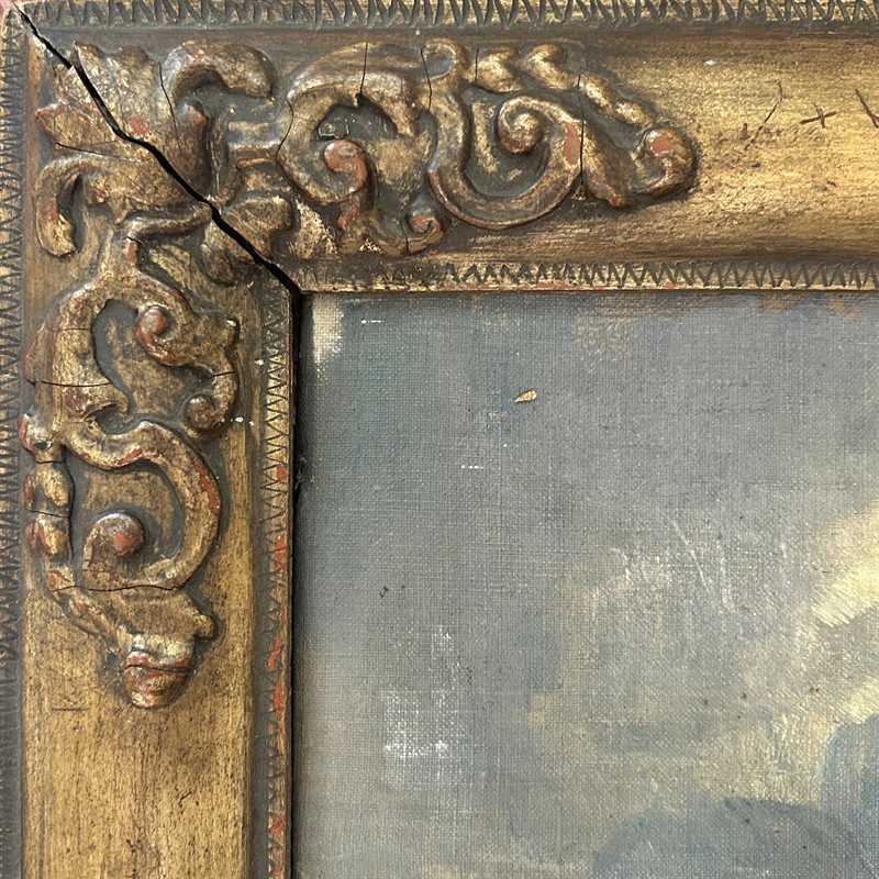 Olej na plátně, rámováno ve zlaceném rámu s dekorativními ornamentálními aplikacemi. Signováno vpravo dole. Výška s rámem 69,5 cm, délka 90 cm, plátno o výšce 60 cm, délka 80 cm. Malba nečištěna, jinak v zachovalém stavu; blindrám v ozdobném rámu volnější, rám s menšími defekty, chybí skoba pro zavěšení.