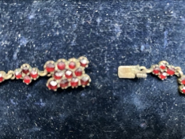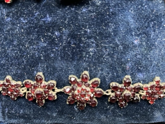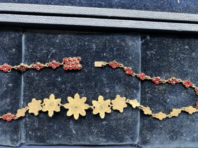 Nabízím k prodeji elegantní starožitný kolier zdobený originálními českými granáty (pyropy) s typickým ohnivě červeným až krvavým odstínem, zasazenými do jemných kovových lůžek. Šperk tvoří souvislá řada drobných květových článků, doplněných několika výraznějšími středovými motivy, které přitahují pozornost díky hustému osazení drobných broušených kamenů. Kolier je proveden v tradičním historizujícím stylu, charakteristickém pro české granátové šperky 19. a počátku 20. století. Každý článek je detailně propracovaný a ručně sestavený. Zapínání je kovové, původní, funkční a nenápadně začleněné do celkového designu. Stav velmi dobrý, bez chybějících kamenů krásně zachovalé lůžkování čisté, výrazné granáty s výborným leskem původní patina dodává šperku autentičnost