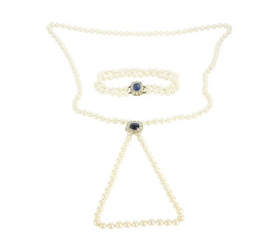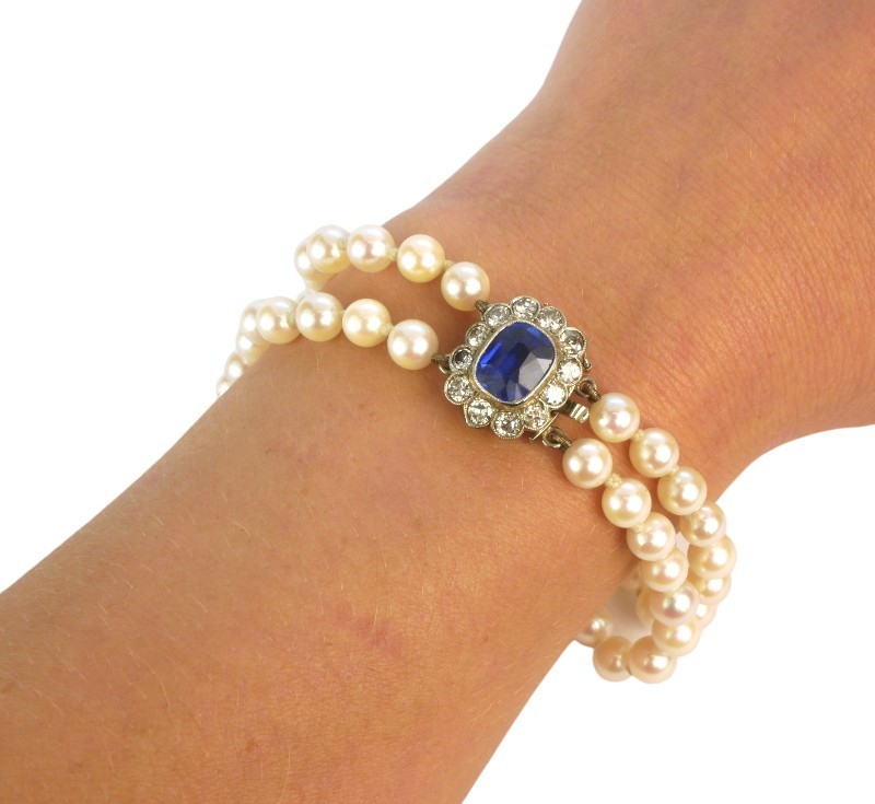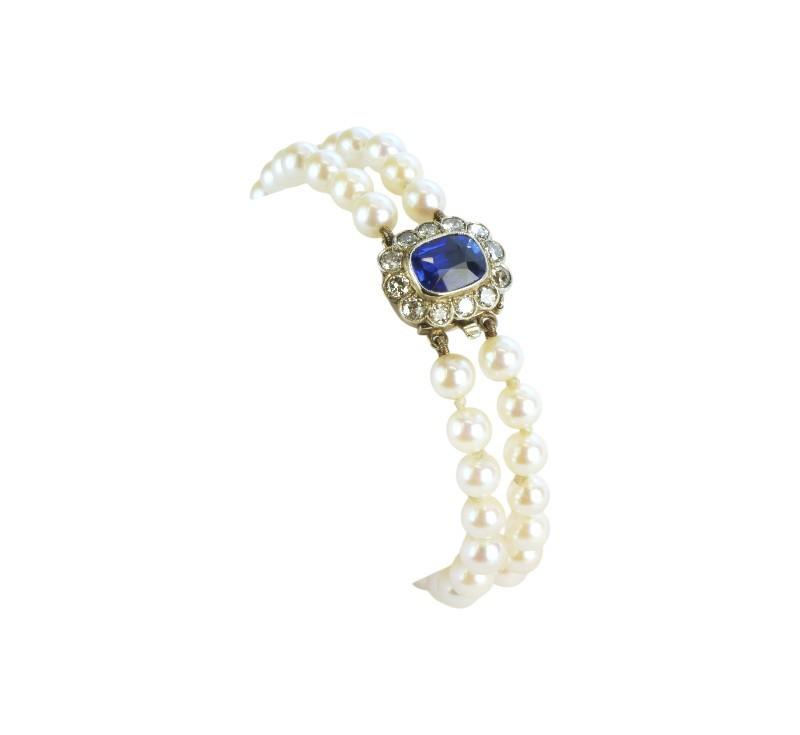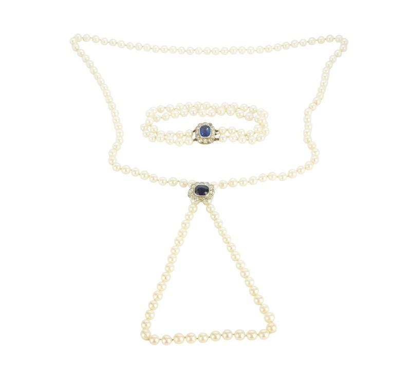 Unikátní souprava šperků - perlový náhrdelník a náramek. Průměr perel 4,6 mm. Na náhrdelníku je umístěn zlatý jezdec se syntetickým safírem a krásnými brilianty celkové hmotnosti 1,0 ct. Shodné parametry má také krásné zapínání u perlového náramku. Zlato ryzosti 585/1000, kameny jsou uloženy ve zlatě ryzosti 550/1000 (Osvědčení Puncovního úřadu). Délka náhrdelníku 84 cm, takže je možné jej nosit i jako kratší dvouřadý. Délka náramku 19 cm, u zapínání je bezpečnostní pojistka. Celková hmotnost soupravy 57,26 g.
