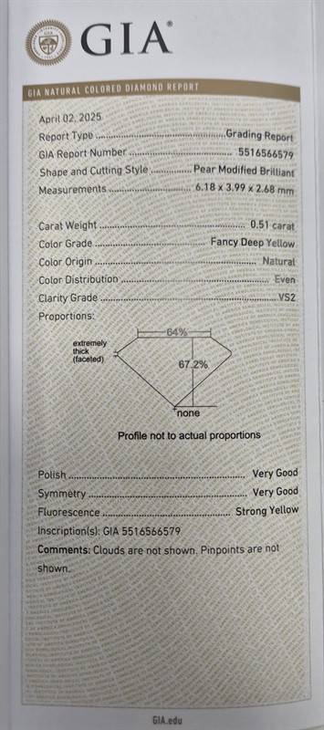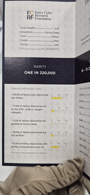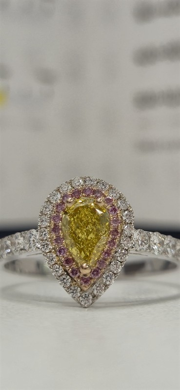 Ponúkam na predaj výnimočný a mimoriadne vzácny šperk s centrálnym prírodným farebným diamantom, doplnený o prírodné ružové diamanty v elegantnom halo dizajne. Ide o exkluzívny klenot vhodný pre náročného klienta alebo ako investičný šperk. Hlavný diamant má váhu 0,51 ct, farbu Fancy Deep Yellow, tvar hruška (pear), čistotu VS2 a je prírodného pôvodu (natural). Je certifikovaný renomovanou inštitúciou Gemological Institute of America (GIA) – č. 5516566579. Prsteň je osadený v luxusnom halo dizajne, ktorý zvýrazňuje centrálny kameň, pričom lemovanie tvorí kombinácia prírodných ružových diamantov (natural pink diamonds) a bielych diamantov pre maximálny lesk. Diamanty sa nachádzajú aj na ramenách prsteňa a celý šperk je spracovaný s dôrazom na detail a vysokú kvalitu. Fancy deep yellow diamanty tejto kvality patria medzi najvzácnejšie farebné diamanty. Podľa Fancy Color Research Foundation (FCRF) ide o výnimočne raritnú kategóriu – len približne 1 z 220 000 diamantov.