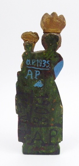 Dřevořezba, polychromie. Přiloženo osvědčení Národního památkového ústavu České republiky. Socha stojící Panny Marie s nahým Ježíškem na levé ruce je zpodobněním Panny Marie Svatohorské. Madona je oblečená v červených šatech a modrém plášti. Obě postavy jsou korunovány. Na jednoduchém zeleném podstavci. Zadní strana plochá a na ní ručně psaný modrý nápis O.P.1935 a písmena AP. Čechy, rok 1935. Výška 21 cm.