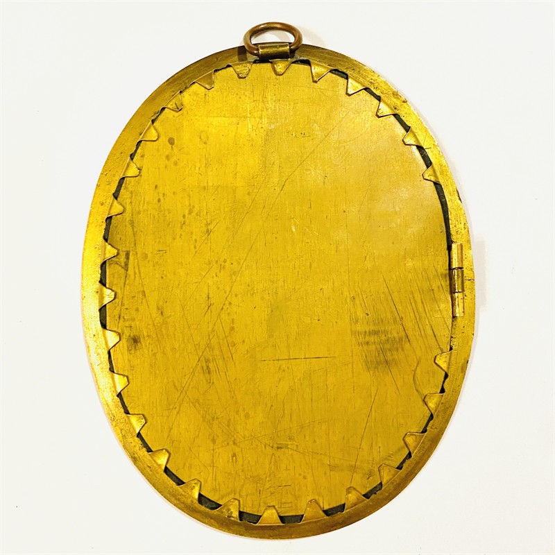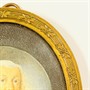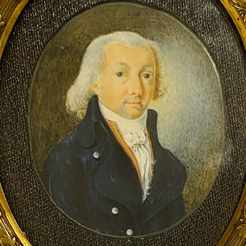 Oválná miniatura s podobiznou šedivého muže v modrém redingotu s červeno-zlatou vestou a bílou košilí se šátkem. Realistický netypizovaný portrét s upřeným pohledem směrem k divákovi, neurčité světelně přechodné modro-šedé pozadí. Velmi jemný malířský rukopis, dominující zejména v provedení obličeje. Kvalitní malba počátku 19. století poplatná zakázkovým miniaturním portrétům té doby, patrně německý či francouzský autor. Nesignováno. Barevný kvaš na slonovině. Rámováno v oválném rámu s klasicizujícím florálním ornamentem, paspartováno černo-stříbřitou textilií, zaskleno. Výška výřezu 69 mm, rám 117, šířka výřezu 59 mm, rám 93 mm. Nečištěno, malba ve velmi zachovalém stavu, rám v dobrém stavu.
