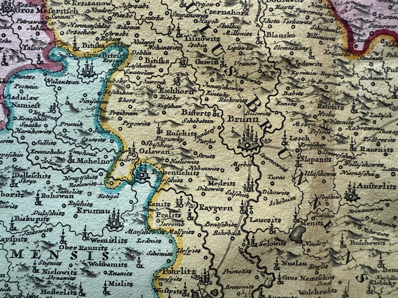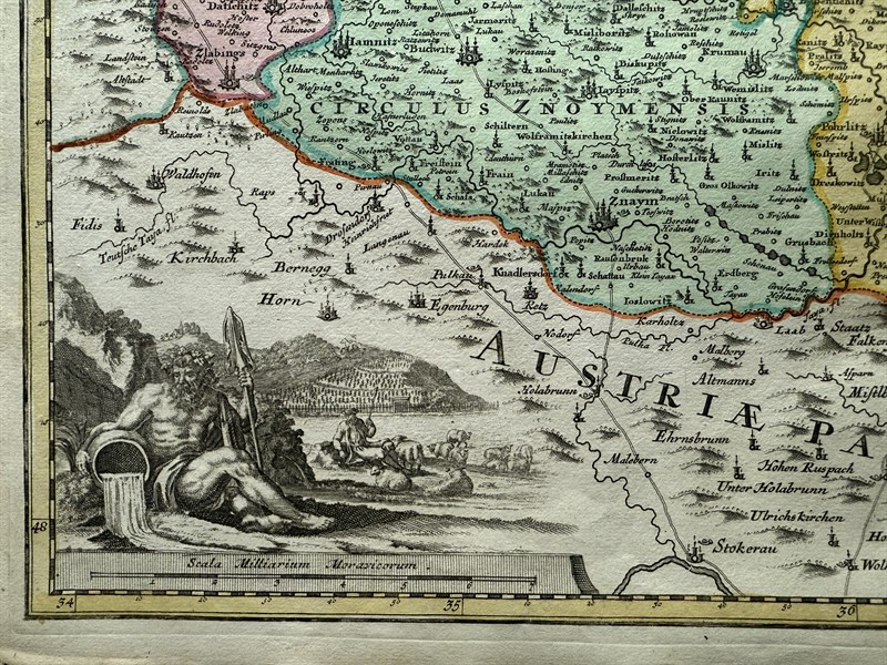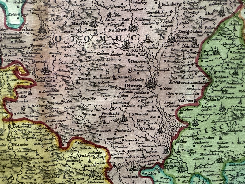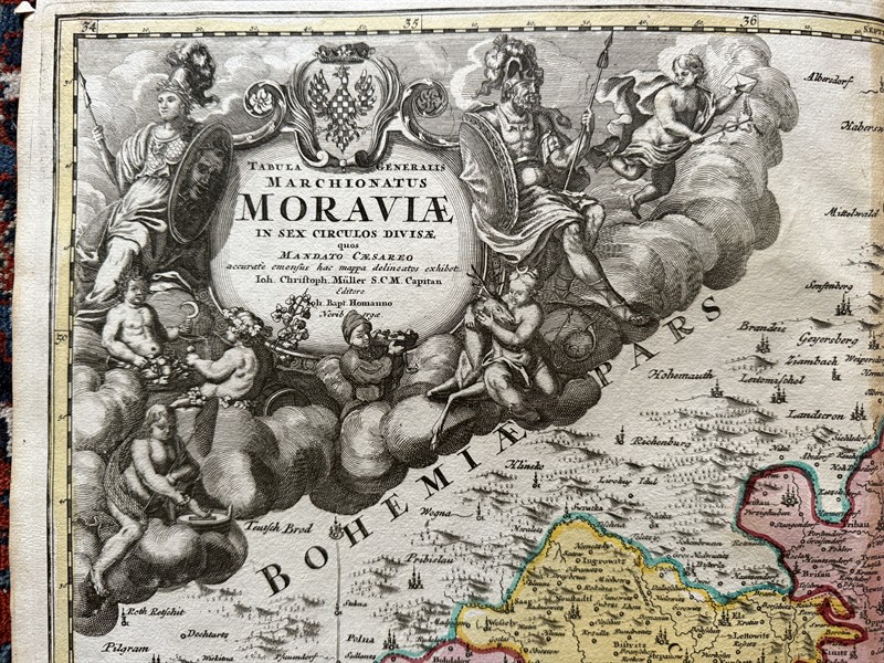 Vydal Johan Babtista Homann podle Müllerové mapy, je tak hodně podrobná, Rozměr 60 x 51 cm, v dobrém stavu. Ručně kolorovaná rytina kolem roku 1700. s krásnou alegorii Moravy v levem hornim rohu. Těchto originálů už nikdy víc nebude Krásná dekorace ale i sběratelský a investiční předmět. Brno , Olomouc Kroměříž, Ostrava, Přerov, Prostějov, Znojmo, Opava.. .