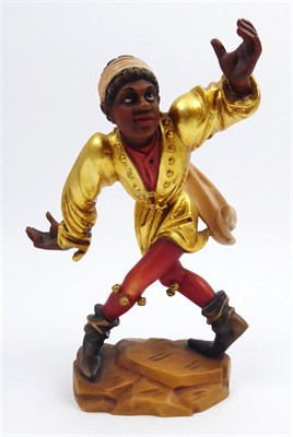 Dřevořezba, polychromie, zlacení. Kopie ze série slavných Moriskentänzer (tanečníků Morrisova tance). Autor originální předlohy: Erasmus Grasser (1450-1518) slavný německý pozdně gotický řezbář, sochař a architekt. Jeho nejznámějším, světově proslulým, dílem jsou právě tito tanečníci. Sérii v originálu vysokých soch z lipového dřeva vytvořil pro taneční sál Staré radnice v Mnichově. Název figury: Mohr (Maur). Výrobce: Řezbářství J. Heinrichmeyer, Rimbach, Německo. Dřevořezba tancujícího Maura se šátkem ve vlasech oblečeného ve zlaceném plášti a červeném spodním oděvu a punčochách s rolničkami obutého do vysokých špičatých bot. Na stylizovaném reliéfním podstavci. Značeno zespodu: originální nálepka řezbářství - Holzschnitzerei J. HEINRICHMEYER, Rimbach. Německo, Rimbach, minulé století. Výška 25 cm, rozměr podstavce 12,5 cm x 8 cm.