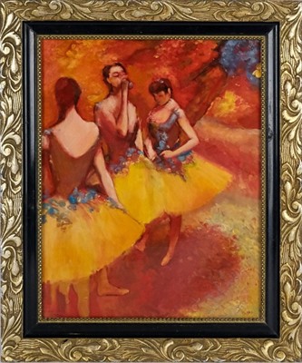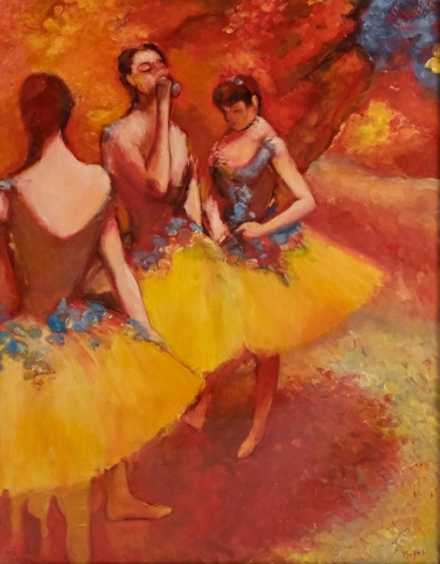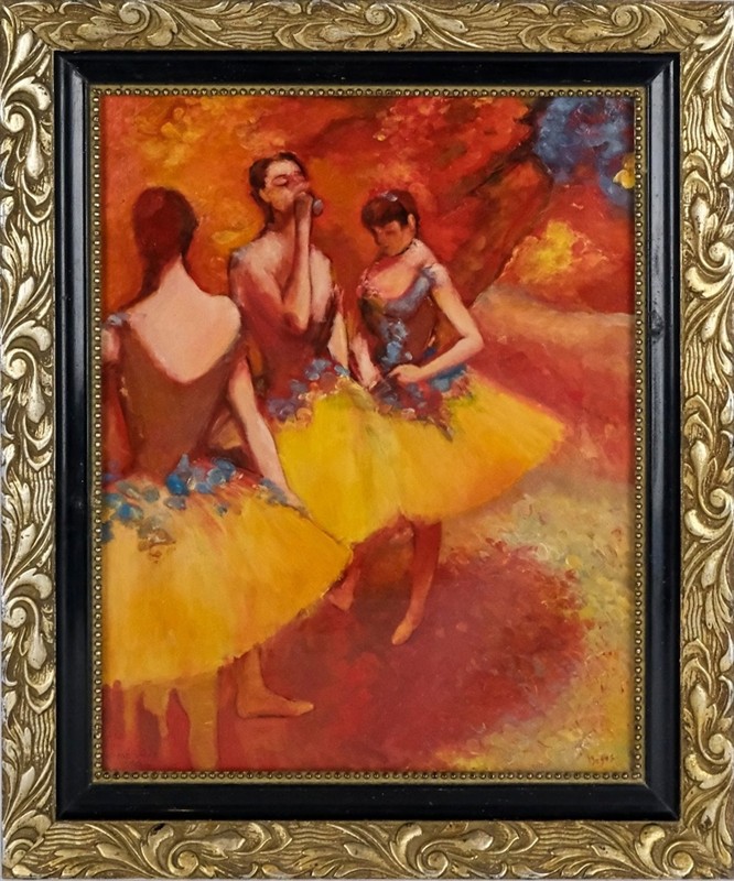 Dle obrazu Edgara Degase Three Dancers in Yellow Skirts. Olej na plátně 44 x 34 cm. Rám výška 53 cm. Dole monogram a popiska Mé lásce s vročením.