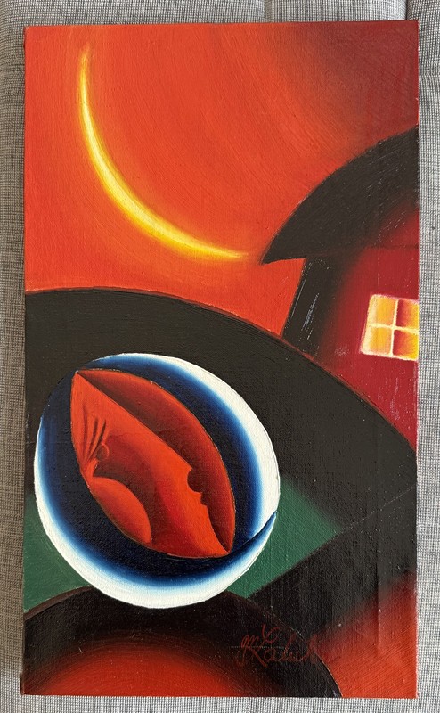 ,,Tetka za měsíce,, oblíbený motiv. 34 x 58,5 cm , bez rámu Milan Laluha,1930-2013 nejdražší a nejvýznamnější slovenský malíř, 1. cena na Bienale 1966, pak zakázaný komunistickým režimem. Zastoupen ve všech významných slovenských galeriich