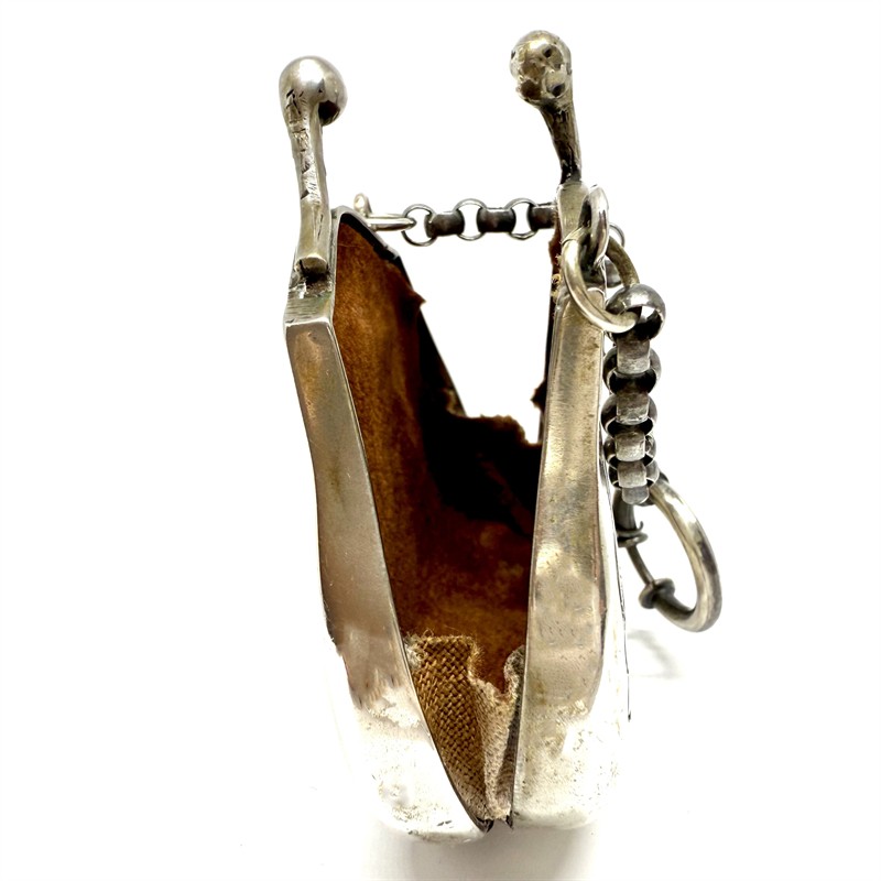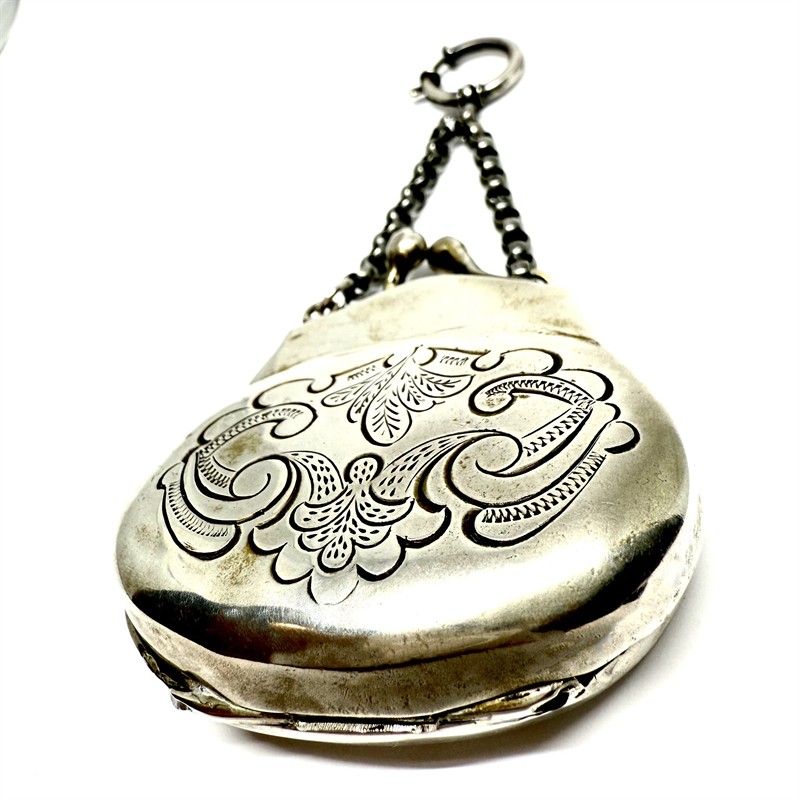 Nevšední, velmi stará, miniatura masivní stříbrné kabelky. Artefakt je možné nosit jako výrazný závěs, či užívat na drobné mince. Zhotoveno ze stříbra ryzosti 835/1000, řetízek a pérový kroužek sterlingové stříbro. Celková váha 66,15 g. Zdobeno hlubokým ručním rytím. Rozměry kabelky bez závěsu 6,5 x 6 cm. Plně funkční.