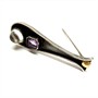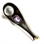 Originální, minimalisticky pojatá stříbrná brož - ryba. Šperk byl zhotoven ze stříbra sterlingové ryzosti (925/1000), o celkové váze 11,07 g. Osazeno muglí horského křišťálu a fazetově broušeným ametystem. Kulička na místě ocasu je z obecného kovu. Rozměry cca 5,5 x 1,5 cm. Osvědčení Puncovního úřadu. Výborný stav.