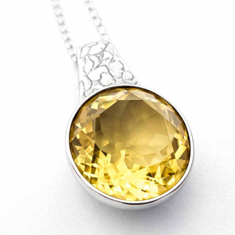 Originální, nadčasový stříbrný náhrdelník. Šperku dominuje rafinovaně broušený citrín střední barevné sytosti, kruhového tvaru. Šperk byl zhotoven ze stříbra sterlingové ryzosti (925/1000). Váha náhrdelníku 9,53 g. Délka řetízku 41 cm. Rozměry závěsu cca 2,5 x 1,5 cm. Perfektní stav.
