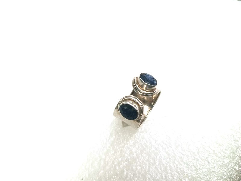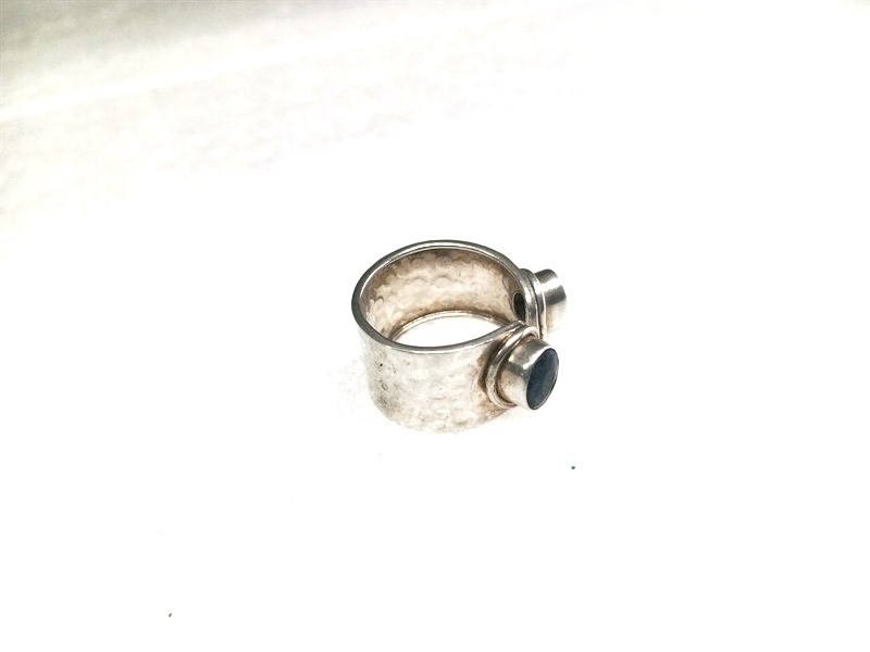 Zajímavý ateliérový prsten vyrobený ze stříbra ryzosti 925/1000 , osázený dvěma modrými kameny broušenými do fazet. Velikost variabilní . Šířka prstenu je 1,4 cm . Hmotnost 6,66 gr . Přiložena boleta Puncovního úřadu.