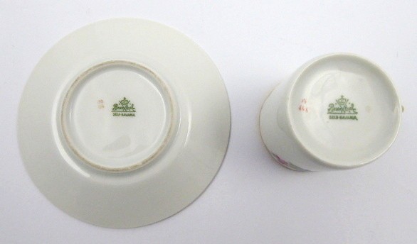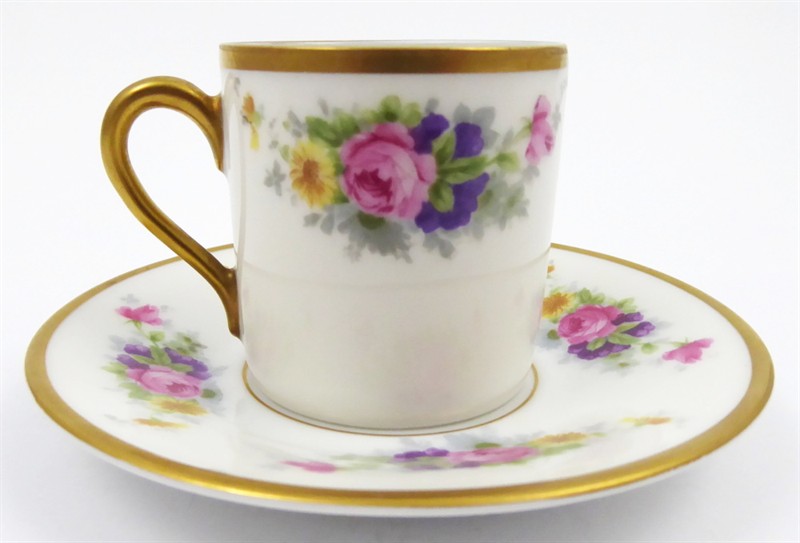 Bílý, barevný a zlacený porcelán. Porcelánka Rosenthal. Kávový šálek z bílého porcelánu dekorovaný barevnými kyticemi a zlacenými linkami. Značeno zespodu: firemní značka a značka malíře. Německo, Selb, 20. léta minulého století. Výška šálku 4,5 cm, průměr podšálku 10,5 cm.