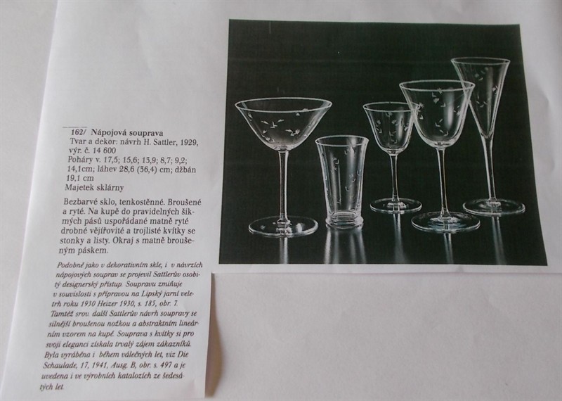 Dvě skleničky Moser se dochovaly z kompletní nápojové soupravy z roku 1929, jejíž tvar a dekor navrhl H. Sattler a tato souprava byla prezentována na Lipském jarním veletrhu v roce 1930. Dochované skleničky na šampaňské jsou z tenkostěnného skla, s rytými vějířovitými a trojlistými kvítky. Okraj skleniček je ozdoben matně broušeným páskem. Na jedné skleničce je originální značka světoznámé sklářské firmy Moser z Karlových Varů. Skleničky jsou vysoké 13,9 cm, průměr patky je 7 cm, průměr skleničky v nejširší části je 11 cm. Skleničky jsou určeny pro sběratele skla nebo skla Moser nebo pro Muzeum skla. Jsou zcela nepoškozené.