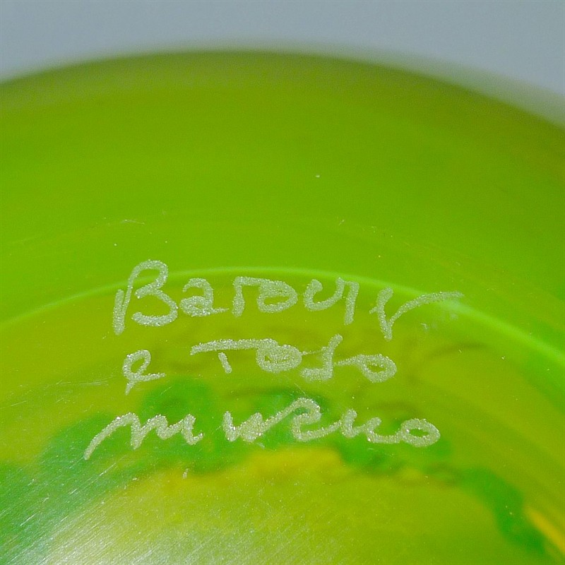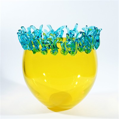 návrh 70./80. léta, provedení sklárna Barovier et Toso, značeno zespodu „Barovier / e Toso / Murano“ (používaná v letech 1971 až 1984), výška 24 cm, průměr 24 cm, žluté sklo s hutně aplikovanými modrozelenými nálepy na horním okraji.
