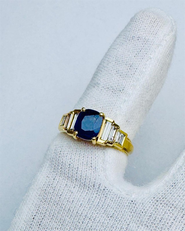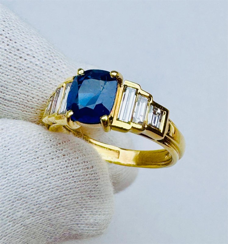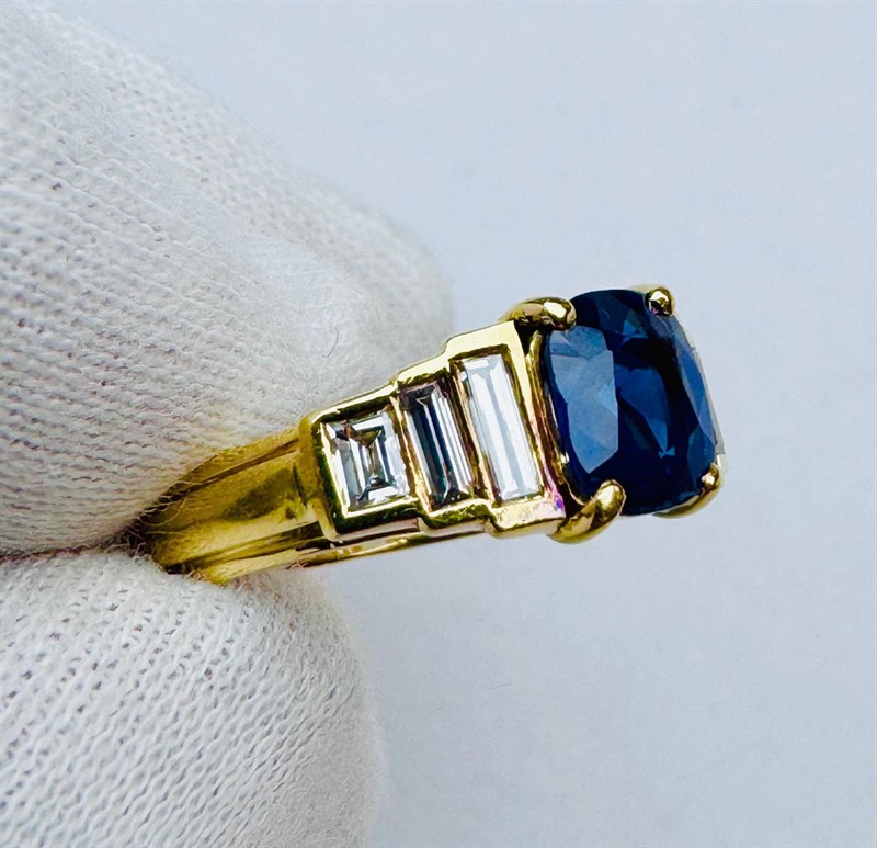 NÁDHERNÝ 18K ZLATÝ PRSTEN SE SAFÍREM A DIAMANTY - 2,10 ct., prsten je osazen přírodním safírem o váze cca. 1,30ct. a diamanty - bagety o váze 0,80ct. G/VSI , prsten je vyrobený ze 14k zlata o váze 3,9 gramů, velikost 51.