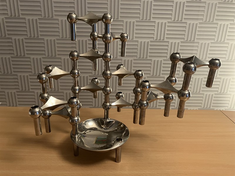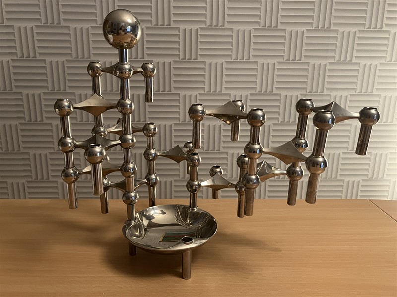 modulární svícen (cín/chrom) navržený architektem Wernerem Stoffem pro kovodělníka Hanse Nagela v Dánsku v 60.letech. Originál ze 60.let., 12ks svícnů + miska + sféra.