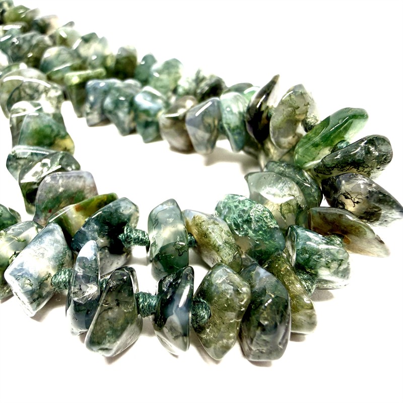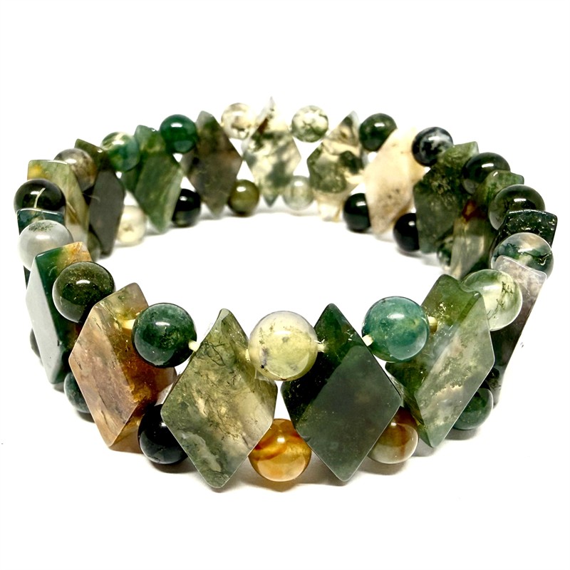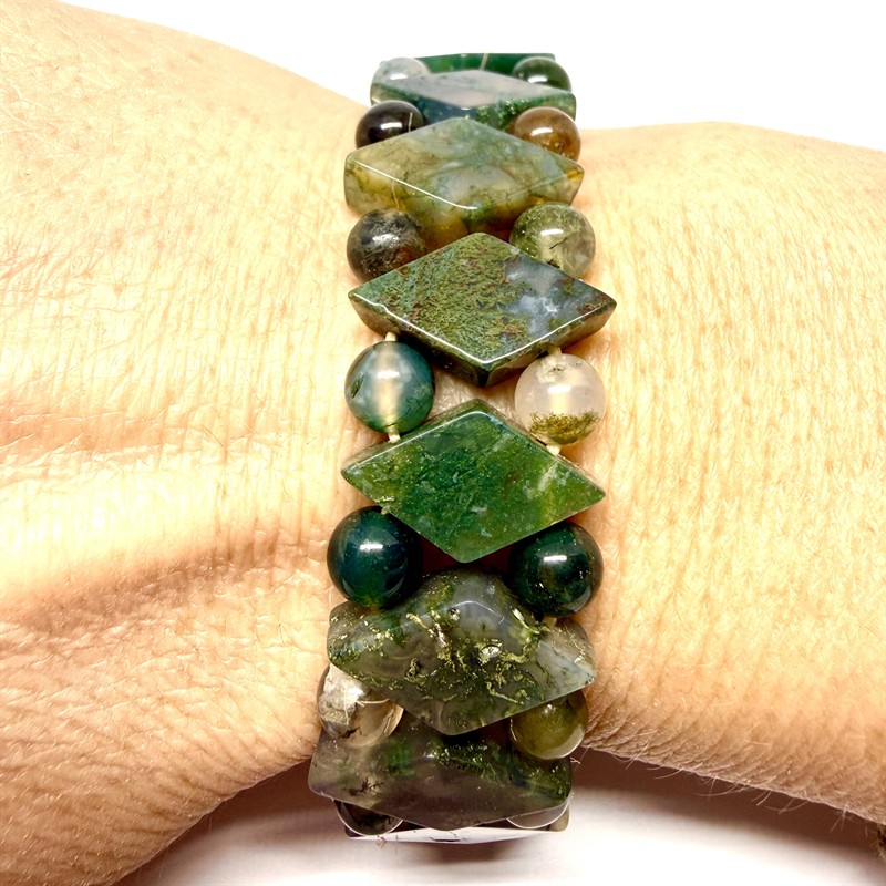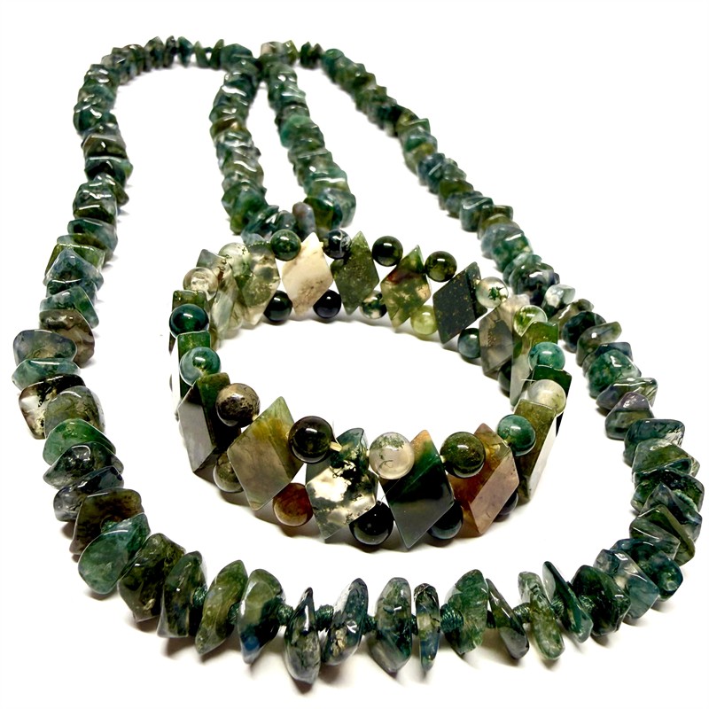 Výrazný set dlouhého náhrdelníku a náramku z mechových achátů půvabného tmavě zeleného odstínu. Náhrdelník dlouhý 44 cm, každý z drahých kamenů je pečlivě prouzlíkován. Náramek variabilní velikost, šířka 1,5 cm. Komplet je ve výborném stavu.