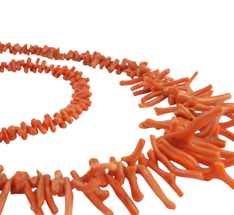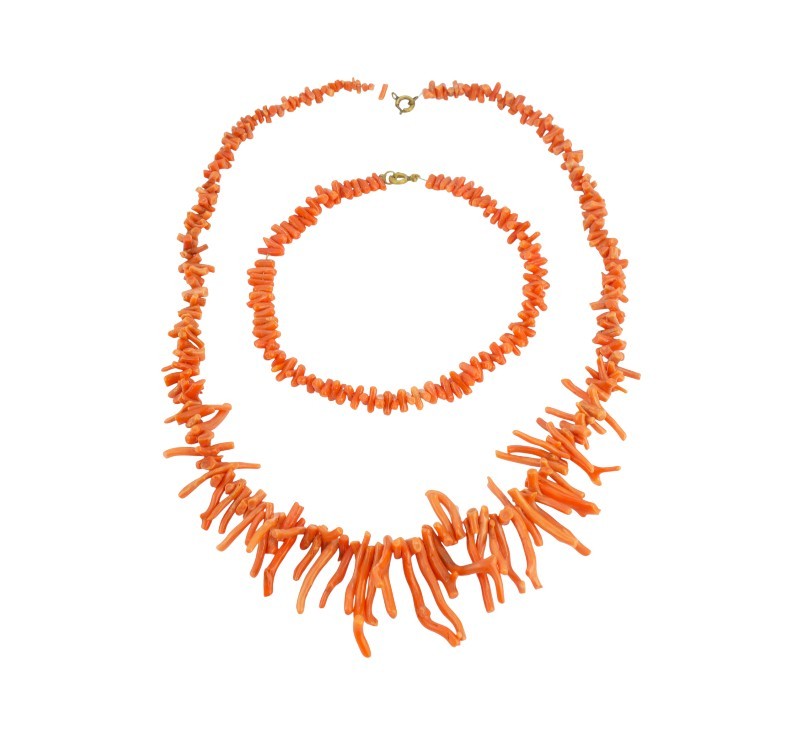 Náhrdelník a náramek jsou zhotoveny z přírodního, neprobarvovaného mořského korálu v charakteristickém lososovém až sytě oranžovém odstínu. Náhrdelník je v přední části gradován a tvořen delšími, leštěnými větvičkami korálu, které směrem k uzávěru přecházejí v drobnější sekané elementy. Délka náhrdelníku 50 cm, délka náramku 26 cm. Zapínání z obecného kovu.