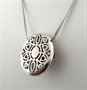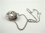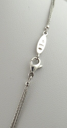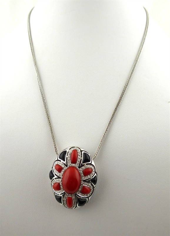 Osmnáctikarátové bílé zlato, přírodní středomořské korály, přírodní diamanty a přírodní leštěný onyx. Ryzost Au 750/1000, celková hmotnost 22,65 g. Ukázka šperkařského umu v podobě designu a preciznosti provedení. Velmi originální krásný náhrdelník z osmnáctikarátového bílého zlata v podobě výrazného závěsu ve tvaru oválného medailonu s centrálními přírodními středomořskými korály v podobenství květenství rozzářeného prostřednictvím 84 drobných přírodních diamantů moderního briliantového brusu o celkové váze 0,45 ct, barva H, čistota Si. Květ doplněný o stylizované lístky z přírodního leštěného onyxu. Na zadní straně závěsu efektní prořezávaný ornament. Na dvojitém elegantním jednoduchém zlatém řetízku. Značeno: český punc kohout, ryzost 750 a mistrovská značka. Itálie, Alessandria, přelom 20. a 21. století. Rozměry: přívěsek 35 mm x 27 mm, délka řetízku 400 mm.