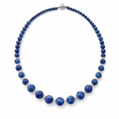 Náhrdelník z pravého lapis lazuli v sytě modrém odstínu s přirozenými zlatavými inkluzemi. Velikost korálků se plynule zmenšuje od 10 mm uprostřed po 4 mm směrem k zapínání, díky čemuž náhrdelník přirozeně kopíruje linii krku a působí elegantně. Do poloviny délky jsou perly jemně doplněny prvky ve stříbrné barvě, které šperku dodávají lehkost a jemně ho opticky odlehčují. Šperk je navlečen na pevné hedvábné niti, která zajišťuje příjemné nošení i dlouhou životnost. Zapínání s 18karátovým pozlacením podtrhuje jeho výrazný, ale decentní charakter. Délka náhrdelníku je přibližně 46 cm.