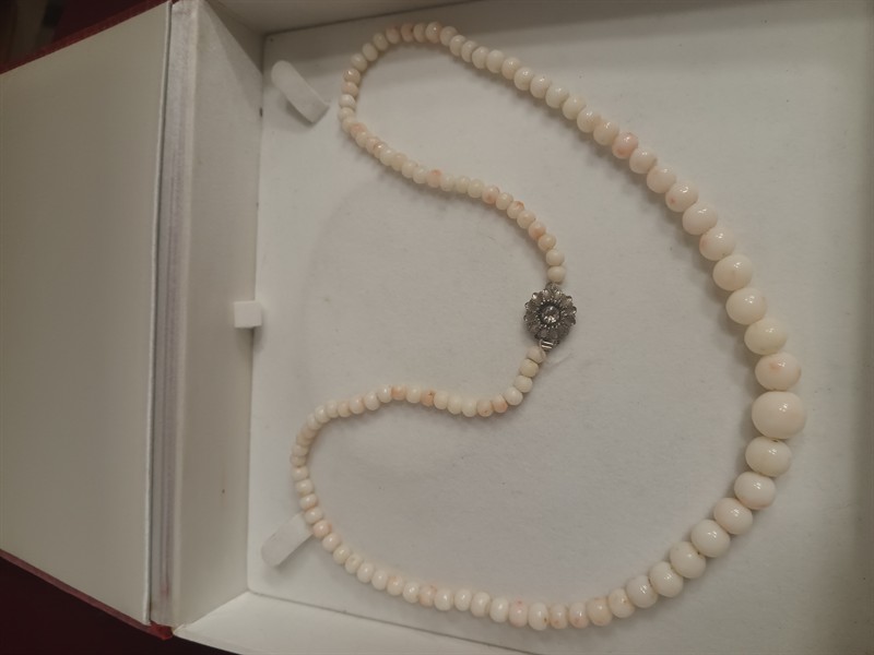 Náhrdelník z velmi světlých korálů sestupné velikosti ( centrální korál v průměru ca 1,3 cm ) . Zapínání z obecného kovu. Délka 55 cm .