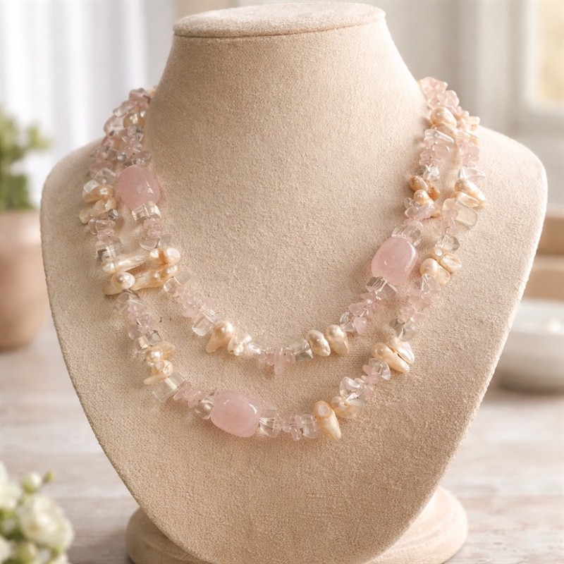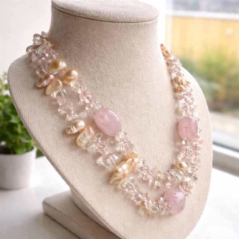 Jemný a přesto nepřehlédnutelný náhrdelník, který propojuje nadčasovou elegancí perel s přirozenou krásou polodrahokamů. Každý kus je originál. Nepravidelné barokní perly dodávají šperku osobitý charakter, růženín vnáší něhu a ženskost, zatímco horský křišťál přináší pocit čistoty a lehkosti. Náhrdelník je navlečen na pevném ocelovém lanku pro maximální odolnost a bezpečné nošení. Zapínání ze šperkařského kovu je pozlaceno 14karátovým bílým zlatem, což podtrhuje jeho luxusní vzhled. Výjimečný doplněk pro každý den i slavnostní chvíle. Ideální dárek pro ženu s citem pro jemnou eleganci a decentní luxus.