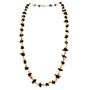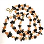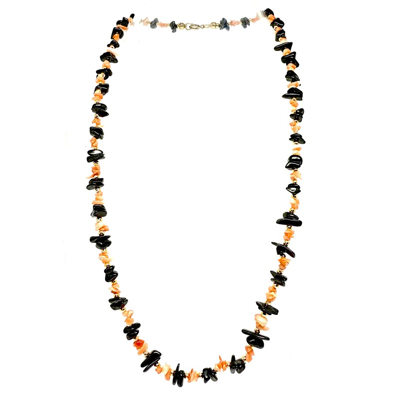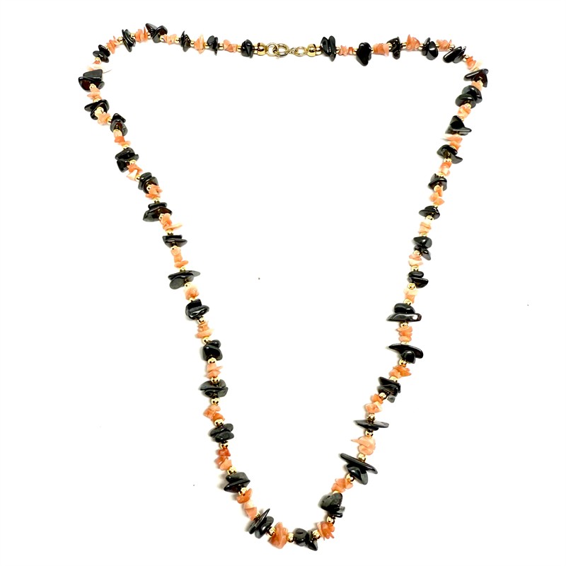 Velmi půvabný, jemný náhrdelník. Šperk byl zhotoven z korálů lososovitého odstínu, které byly kontrastně doplněny o tmavě šedé hematity. Délka 45 cm, Zapínání ze zlaceného kovu. Perfektní stav.