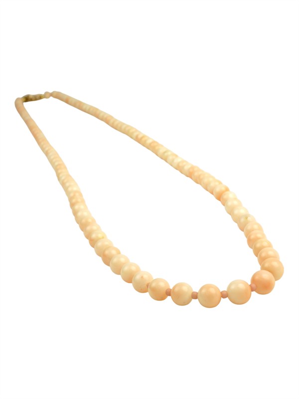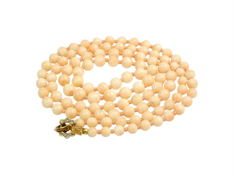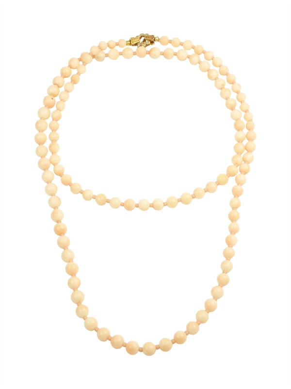 Náhrdelník je vyroben z přírodního růžového korálu známého jako "andělská kůže" (Angel Skin Coral). Tento typ korálu je typický svou jemnou, bledě růžovou až krémovou barvou a je opatřen se zdobným uzávěrem ze zlata ryzosti 585/1000. Délka 80 cm. Pečlivě prouzlíkovaný.