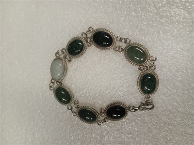 Náramek vyrobený ze stříbra ryzosti 925/1000, s nefrity různých odstínů . Karabina z obecného kovu . Délka náramku je 18,5 cm . Hmotnost 16,16 gr. Přiložena boleta Puncovního úřadu.