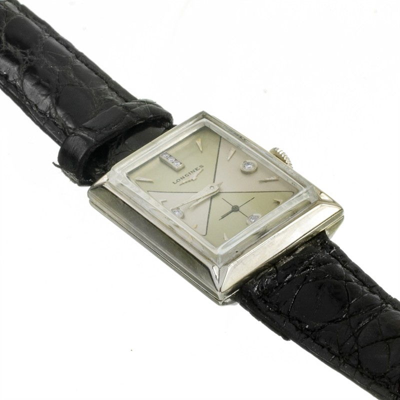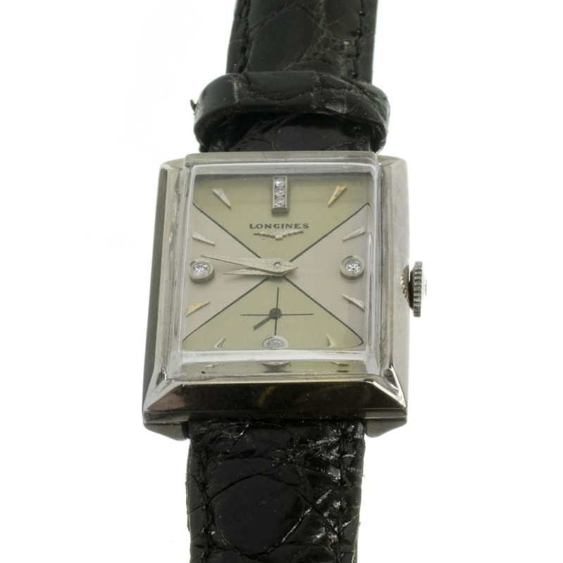 Náramkové hodinky švýcarské značky Longines z obecného kovu v Art-deco stylu. Funkční. Švýcarsko, 20. léta 20. století. rozměry hodinek: 3x2,3cm.