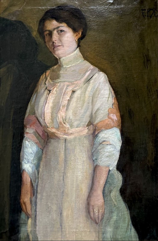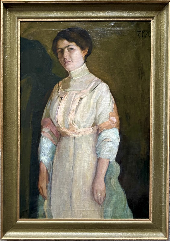 Krásný portrét autorovy manželky a herečky Růženy Naskové z doby před r. 1910. Olej na plátně o velikosti 90 x 61 cm, rámováno, signováno vpravo nahoře. Pravost potvrzena autorem monografie Dr. Jiřím Hořavou. František Xaver Naske (1884-1959) byl významný český malíř portrétů a figurálních motivů. Studoval na AVU v Praze u prof. Schwaigera a Roubalika. Byl členem Jednoty umelcú výtvarných (JUV). Zastoupen je ve sbírkách Ng v Praze.