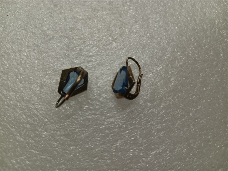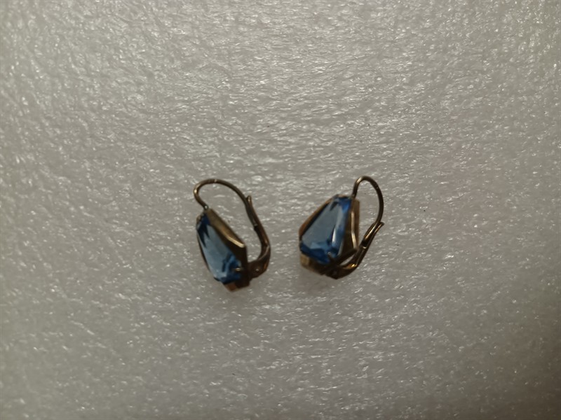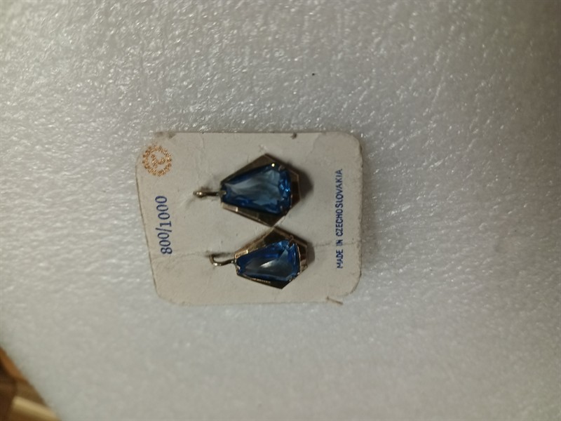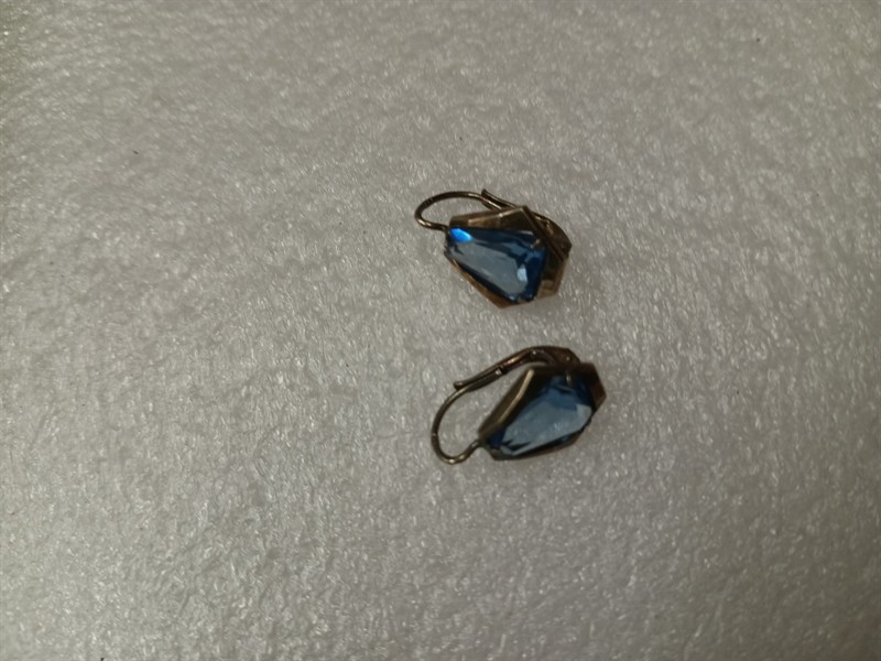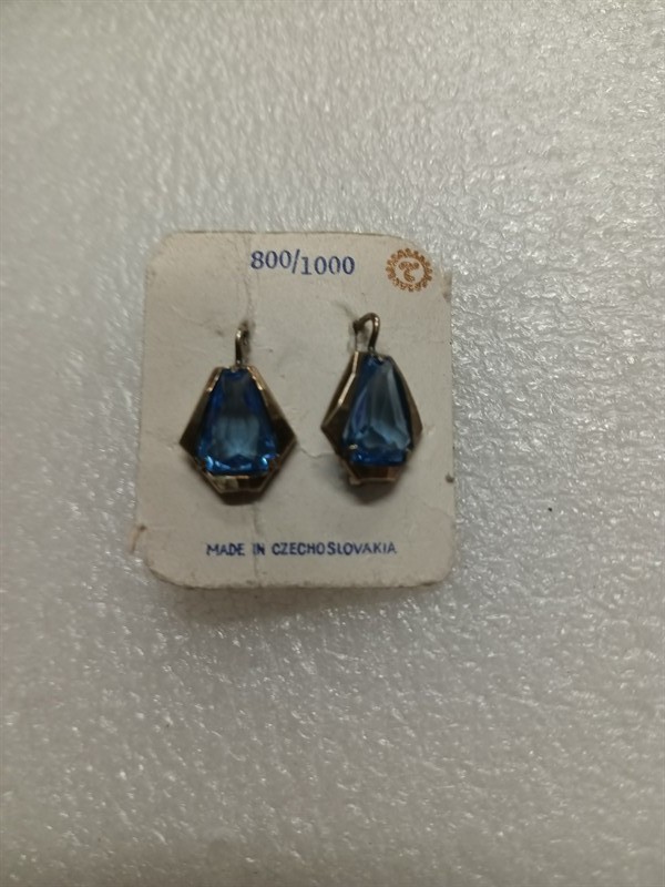 Starožitné náušnice s původní etiketou , pozůstalost ze starého zlatnického obchodu . Náušnice jsou nenošeny , vyrobeny ze stříbra ryzosti 800/1000 , s krásným modrým kamenem . Stříbro je zlacené . Délka náušnic je 1,7 cm . Hmotnost 3,11 gr