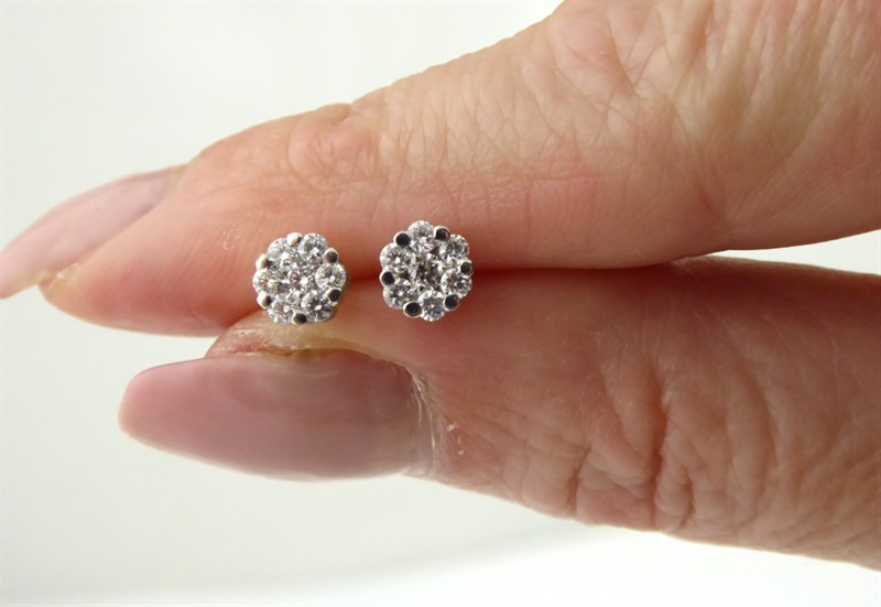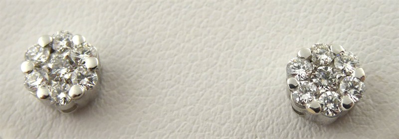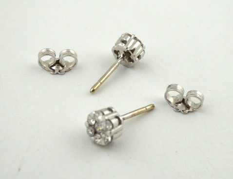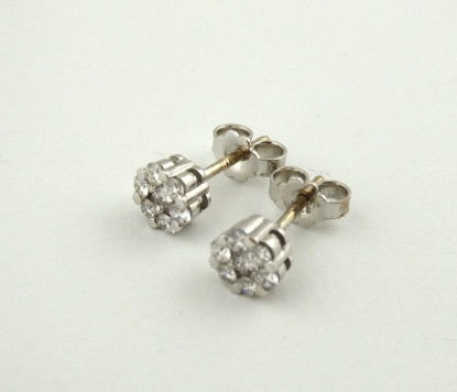 Bílé osmnáctikarátové zlato, 14 přírodních diamantů o celkové váze 0,45 ct. Náušnice z bílého osmáctikarátového zlata se 14 přírodními diamanty moderního briliantového brusu, barva G-H, čistota Si, o celkové váze 0,45 ct. Náušnice jsou ve vynikajícím stavu a mají zapínání na puzetu. Značeno: ryzost 750 a nově označeno platným českým puncem kohout. Evropa, čtvrtá čtvrtina minulého století. Rozměr: průměr 5 mm.