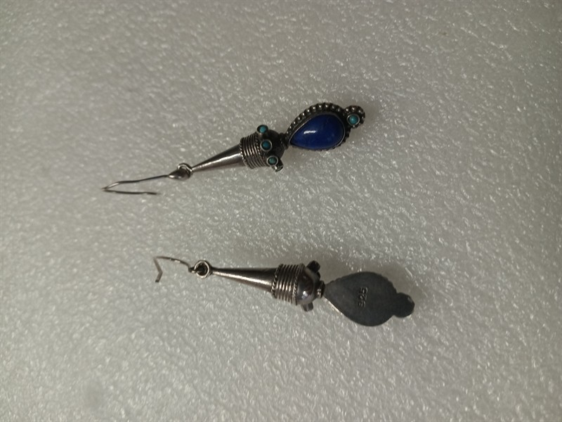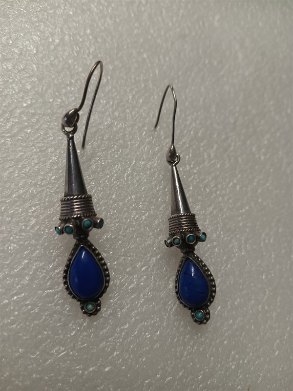 Dlouhé visací náušnice vyrobené ze stříbra ryzosti 925/1000, s tyrkysy a lapis lasuli. Hrubá hmotnost 9,38 gr. Délka 63 cm . Přiložena boleta Puncovního úřadu.