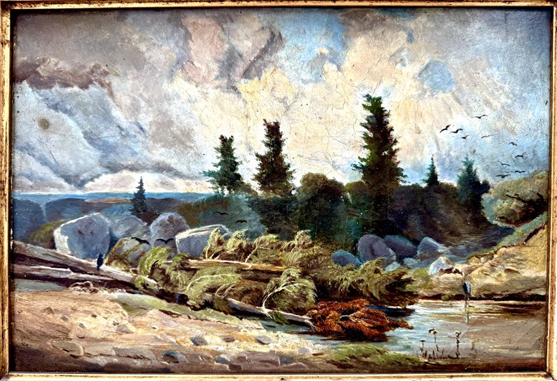 Zajímavý a kvalitní olej na desce o velikosti 21 x 30,5 cm, celkový rozměr je 40 x 50 cm. Rámováno v púvodní dobové adjustaci, krásném galerijním rámu. Signováno nečitelně vlevo dole. Odborně vyčistěno,