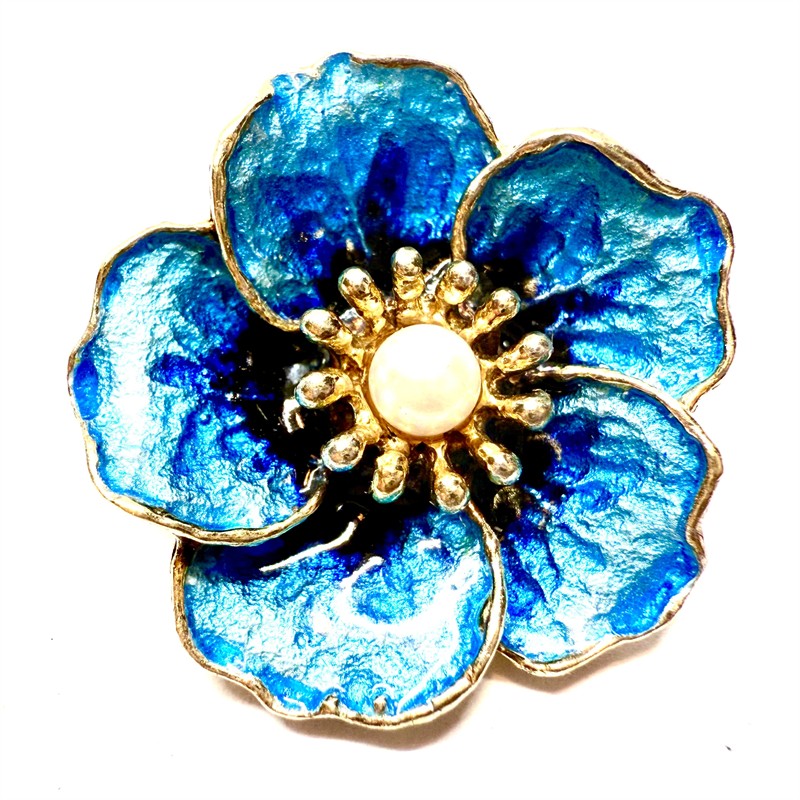 Velmi půvabná stříbrná, zlacená brož zdobená smaltem a bílou perlou. Drobnější designový šperk byl vyroben v Norsku počátkem druhé poloviny 20.století. Signováno. Sterlingové stříbro 925/1000, celková váha 5,26 g. Průměr 2,3 g. Brož, jež může být užívána i jako závěs vyniká mimořádnou kvalitou zpracování. Perfektní stav.