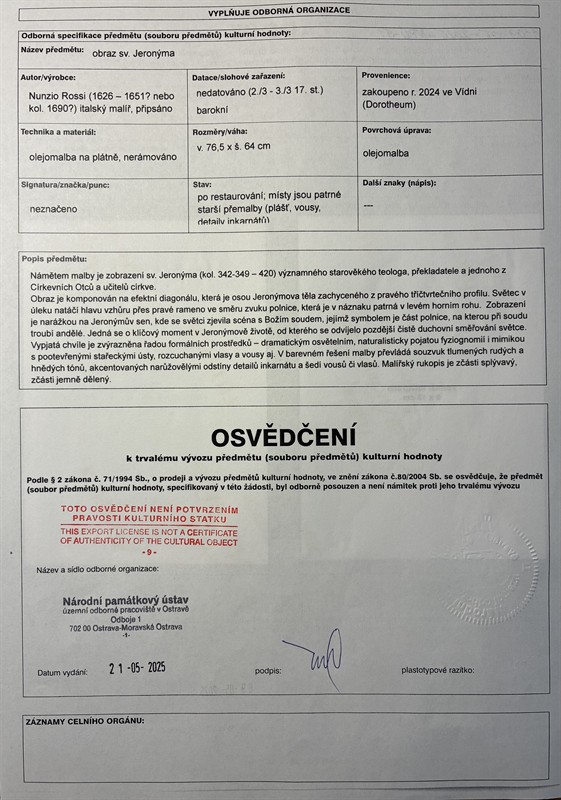 Olej na plátně, 77 x 64 cm (s barokním rámem 96 x 83 cm), obraz odborně vyčistěn a konzervován ve Vídni. Dílo posoudil Prof.Riccardo Lattuada z neapolské univerzity a jednoznačně připsal tomuto malíři neapolské školy. Tvořil v letech 1644 až 1651 v Neapoli a Palermu a toto je jeden z jeho nejlepších obrazů. Zemřel na Sicílii v Palermu, ale rok úmrtí není spolehlivě doložen, uvádí se rok 1651, ale někde až rok 1690. Obraz prošel aukcemi v Londýně a Vídni. San Girolamo, Svatý Jeroným, původním jménem Sophronius Eusebius Hieronymus, také Hieronymus ze Stridonu (345 - 420). Křesťanský učenec a sekretář papeže Damase. Obraz jej zachycuje vytrženého z práce na knize troubením k Poslednímu soudu, poplašeného a vyděšeného. Bože už ? Nejsem ještě hotov … K obrazu bylo vystaveno Osvědčení k trvalému vývozu předmětu kulturní hodnoty (viz foto). Literatura: E. Ghetti, D. Benati (eds.), Massimo Turchi. La collezione, Turín 2019, str. 184, č. 103, ilustrace str. 185 (připsáno Giovanni Battistovi Langettimu)