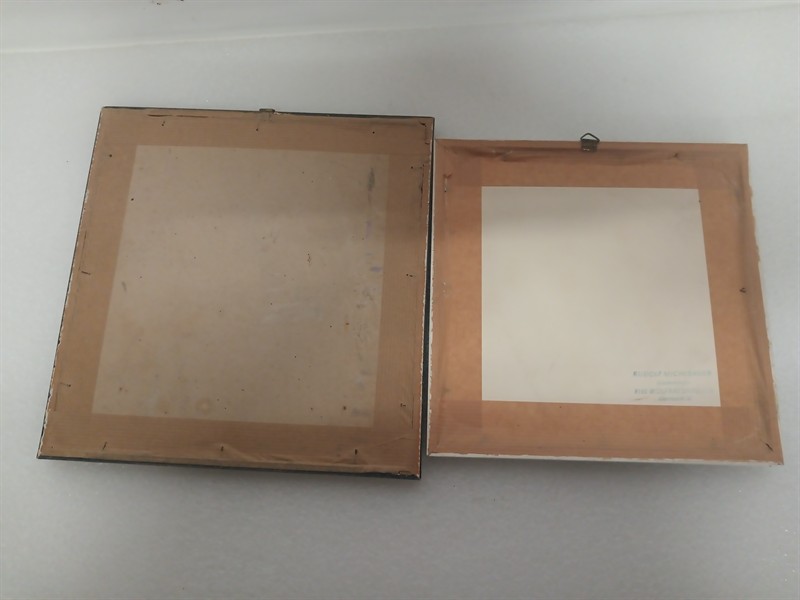 Dvě karikatury - kombinovaná technika pod sklem - signováno Reichardt. Rozměry 22 x 21,5 cm a 19,5 x 19,5 cm .