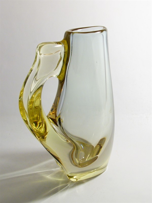 Málo vídané provedení velmi masivní vázy s uchem - objekt z hutního skla s jádrem v odstínu Alexandrit (Neodymové sklo mění barvu podle spektra osvětlení, viz foto) je přejímané sklem v odstínu Citrín. Autorem návrhu je sklářský výtvarník a pedagog Miloslav KLINGER (*1922 +1999). Provedly sklárny Železnobrodské sklo po roce 1970. Dobrý stav, rozměr - v. 24 x 15 x 8cm, hmot. 2,4kg