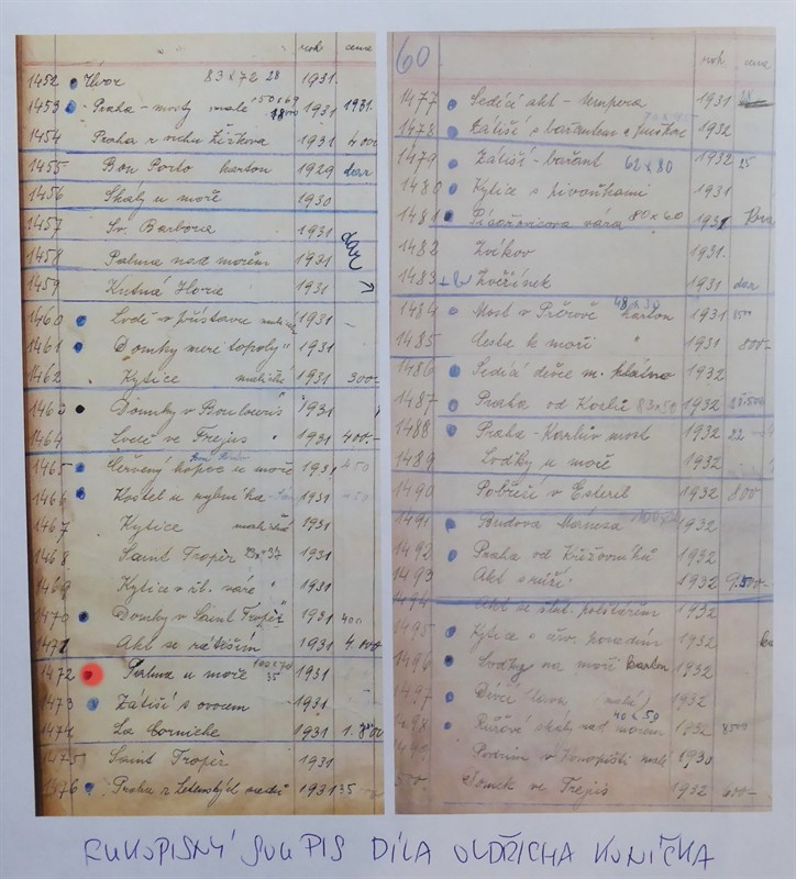 Olej na plátně 70 cm x 100 cm. Signováno vpravo dole. Vzadu na plátně číslo katalogu 1472, k obrazu přiložena obrazová příloha z rukopisného soupisu díla Oldřicha Koníčka. Rozměrná olejomalba s pohledem na mořskou zátoku pod korunami stromů s palmami v popředí. V průhledu v zadní části obrazu zachycena pláž, domky a plachetnice. V originálním zlatě patinovaném ručně řezbovaném rámu. Francie, Côte d'Azur (Francouzská Riviéra), rok 1931. Celkový rozměr s rámem 89 cm x 119 cm.