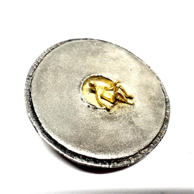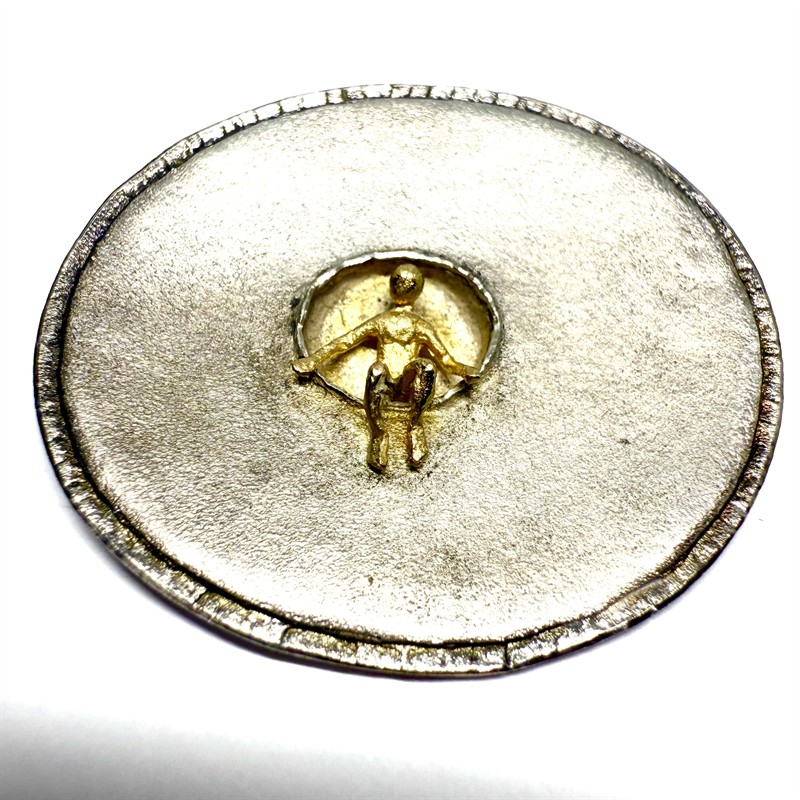 Originální, autorská brož, jež může být užívána i jako závěs. Šperk byl zhotoven ze sterlingového stříbra (925/1000) a zdobí jej kontrastně zlacená, sedící figura. Povrch šperku zdobí jemné matování. Vysoká řemeslná kvalita zpracování. Celková váha 8,87g. Rozměry šperku cca 3,5 x 3 cm. Autorská, ryzostní a puncovní značka. Perfektní stav. Řetízek není součástí prodeje.