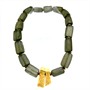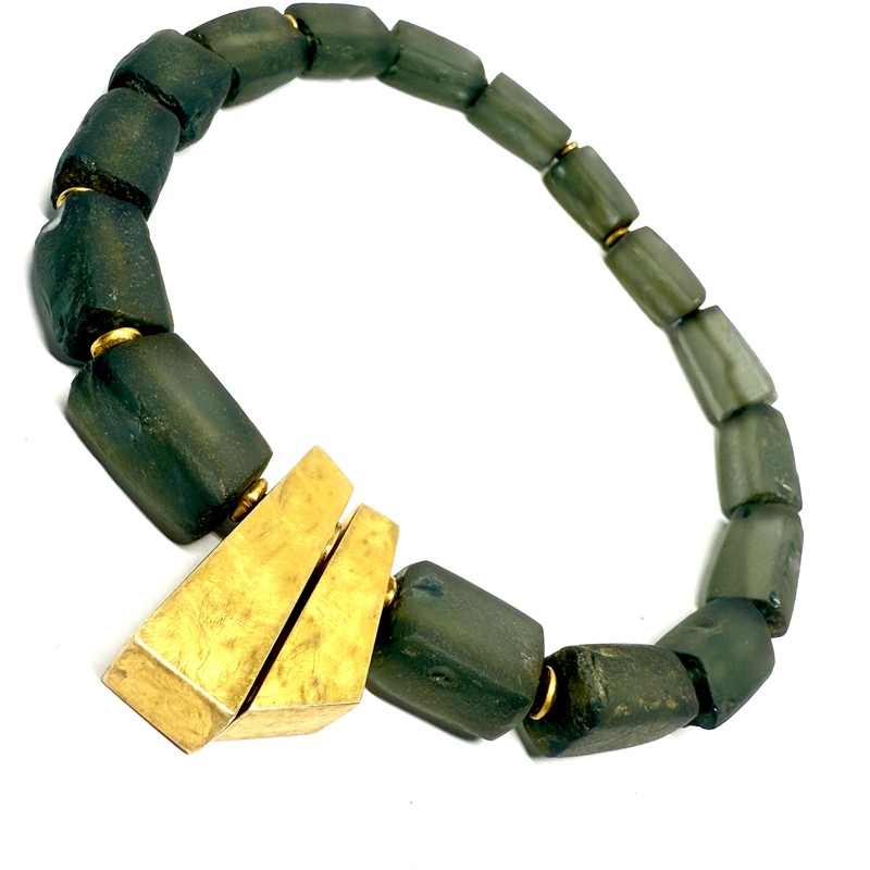 Originální, autorský náhrdelník z mořského skla lahvově zelené barvy. Šperku dominuje nevšední, rafinované, výrazné zapínání ze zlaceného stříbra. Povrch zdoben výrazným matováním. Stříbro ryzosti 925/1000, celková váha 195,76 g. Délka 47 cm. Výborný stav.