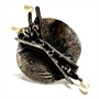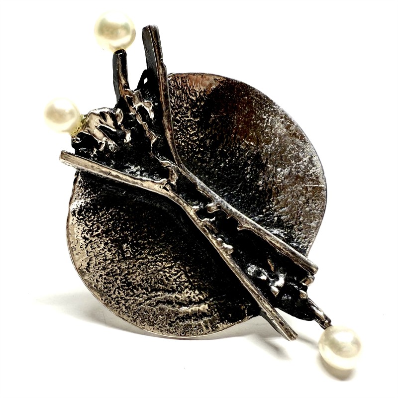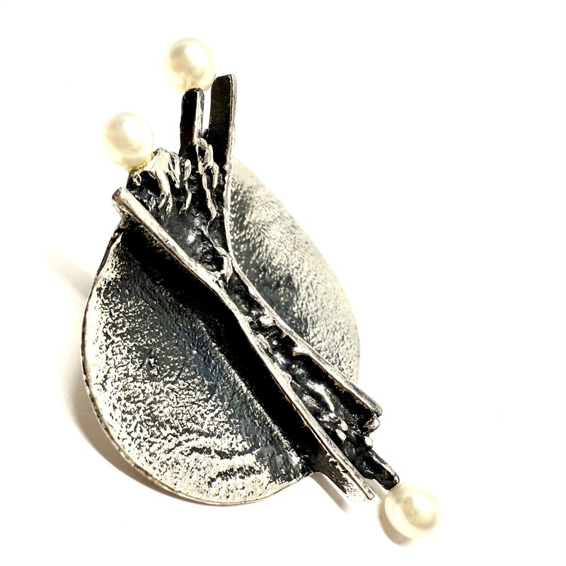 Originální, abstraktní stříbrná brož zdobená třemi sněhobílými perlami. Stříbro ryzosti 925/1000, jehla obecný kov. Celková váha 14,86 g. Rozměry cca 4,5 x 3,5 cm. Výborný stav.