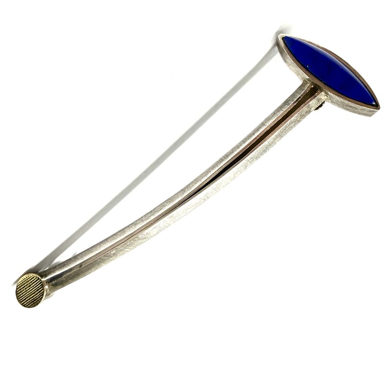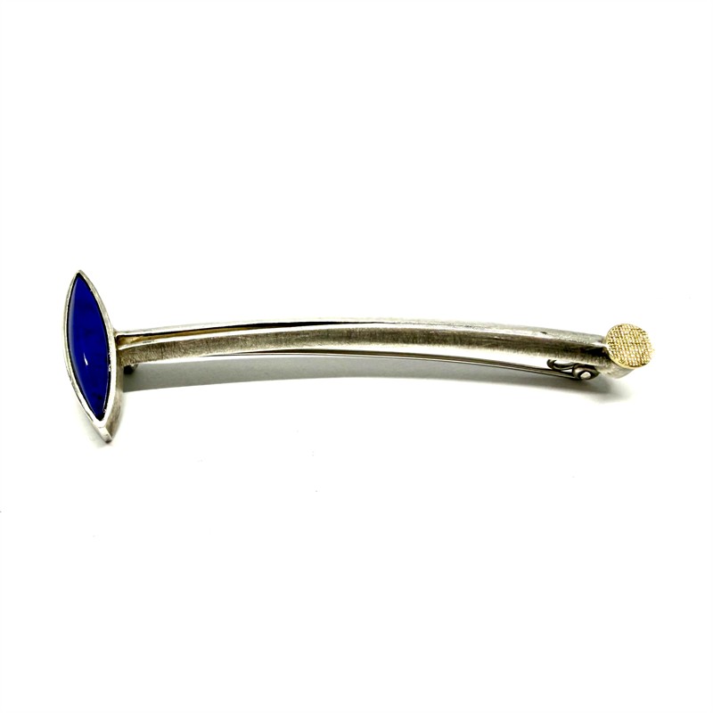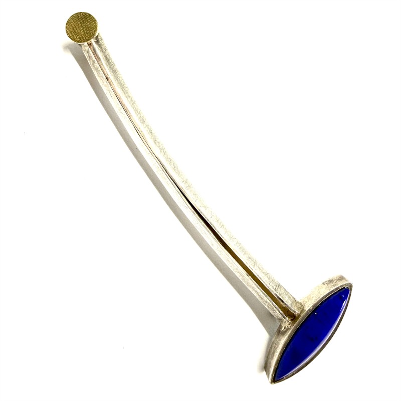 Originální, ateliérová, minimalisticky ztvárněná brož. Šperk byl zhotoven z téměř ryzího stříbra (950/1000), o celkové váze 8,24 g. Zdobeno sytě modrým lápisem lazuli a 18ti karátovým zlatem. Vysoce kvalitní zpracování i použitý materiál. Jehla z funkčních důvodů z obecného kovu. Brož je v perfektním stavu.