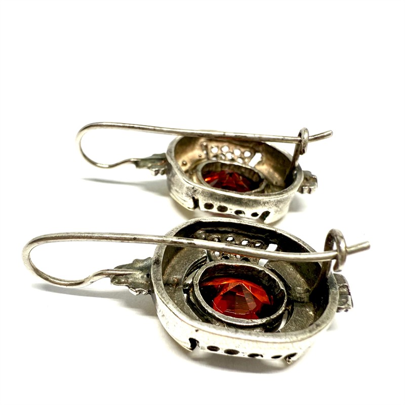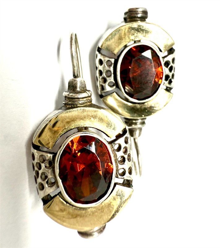 Originální, závěsné náušnice. Zhotoveny ze sterlingového stříbra (925/1000),o celkové váze . Náušnicím dominuje kubická zirkonie ve výrazném koňakovém odstínu. Nevšední, krásnou barvu kamene podtrhují pláty z nízkoryzostního zlata. Hmotnost 10,73 g. Ke šperku je zhotoveno Osvědčení Puncovního úřadu. Délka 3,2 cm. Perfektní stav.