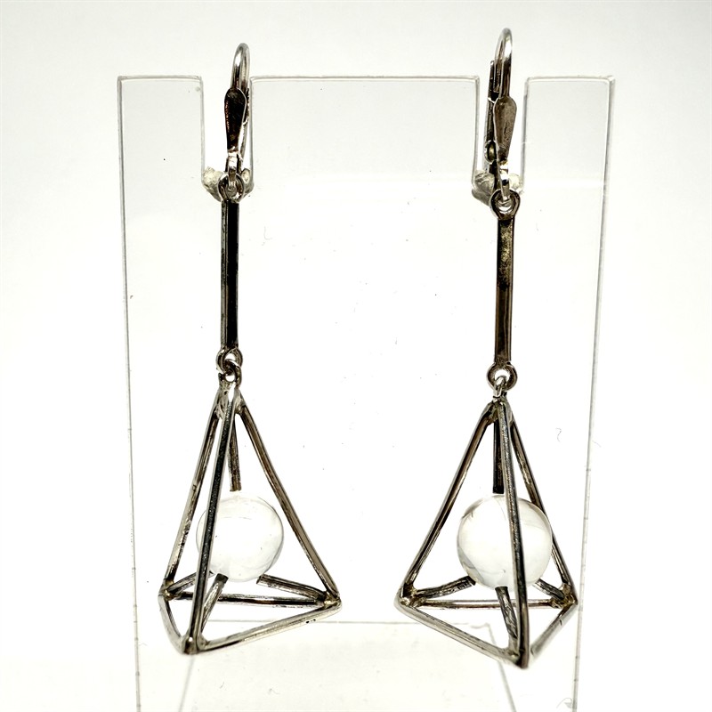 Nevšední, delší závěsné náušnice s kuličkou horského křišťálu. Náušnice byly zhotoveny ze sterlingového stříbra (925/1000), o celkové váze 5,36 g. Délka cca 5 cm. Vyčištěno zlatníkem, perfektní stav.
