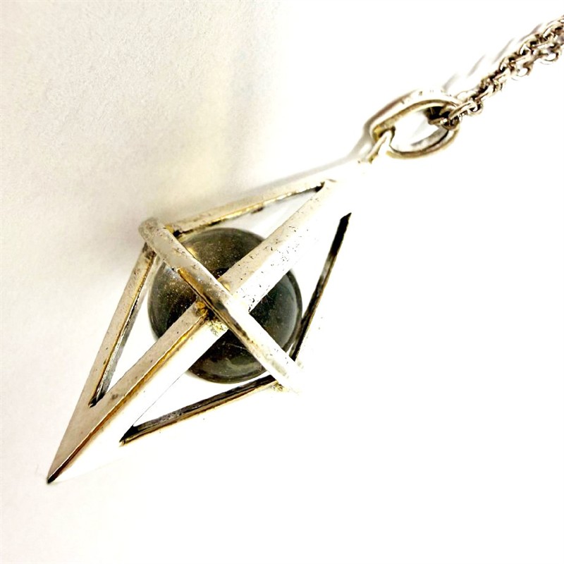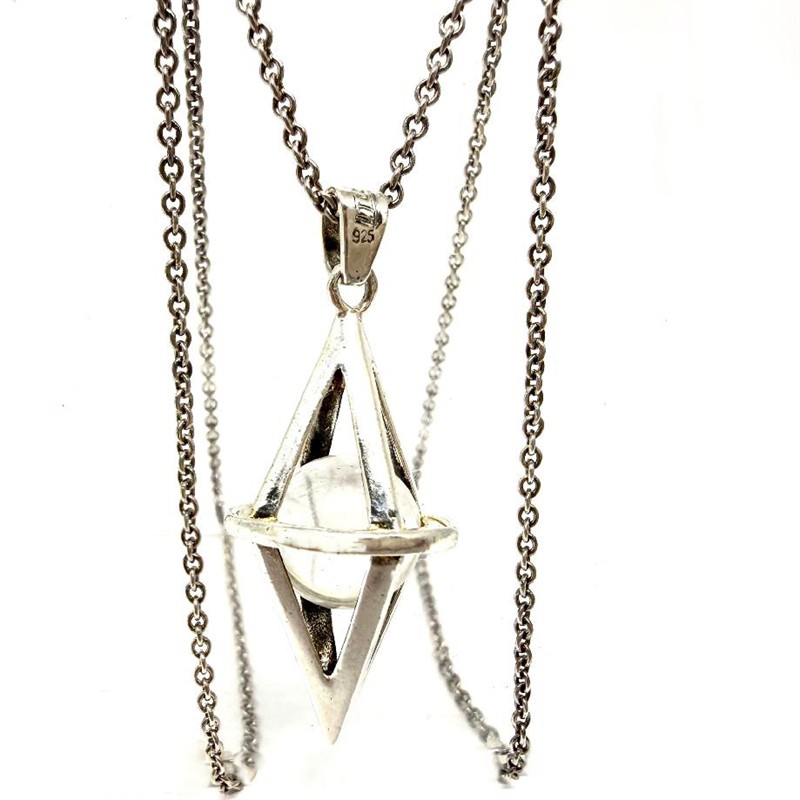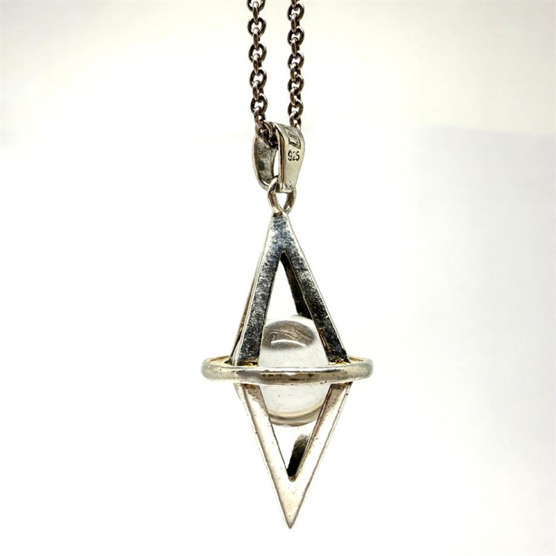 Nevšední stříbrný náhrdelník - řetízek zdobený odnímatelným závěsem. Jedná se o kuličku horského křišťálu v kleci. Šperk byl vyroben ze stříbra sterlingové ryzosti (925/10000). Řetízek stříbro 835/1000, délka 46 cm. Délka závěsu 3,5 cm.