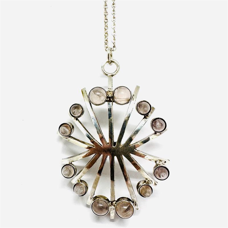 Stříbrný náhrdelník s velmi nevšedním odnímatelným závěsem. Šperk byl vyroben ze stříbra ryzosti 830/1000. Zdobí jej 12 růženínů, hladkého kulatého brusu kabošon, 8 z nich je kónicky vybroušených. Závěs je větší, rozměry 7 x 4,5 cm. Řetízek délkám 48 cm byl vyroben ze stříbra ryzosti 48 cm. Nevšední, designový šperk v perfektním stavu.