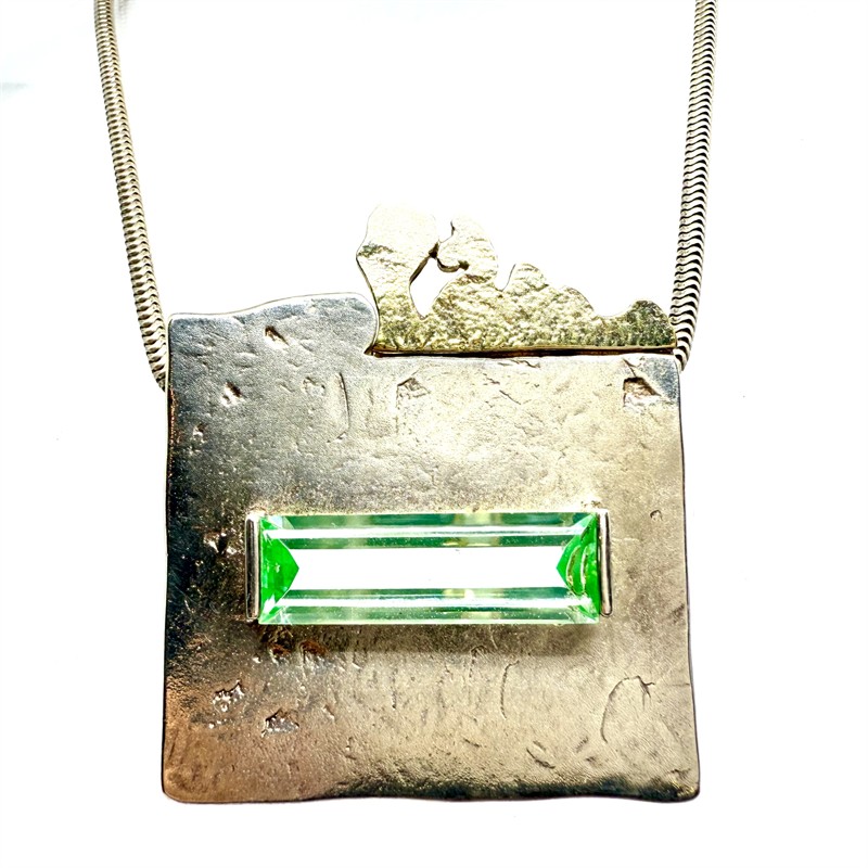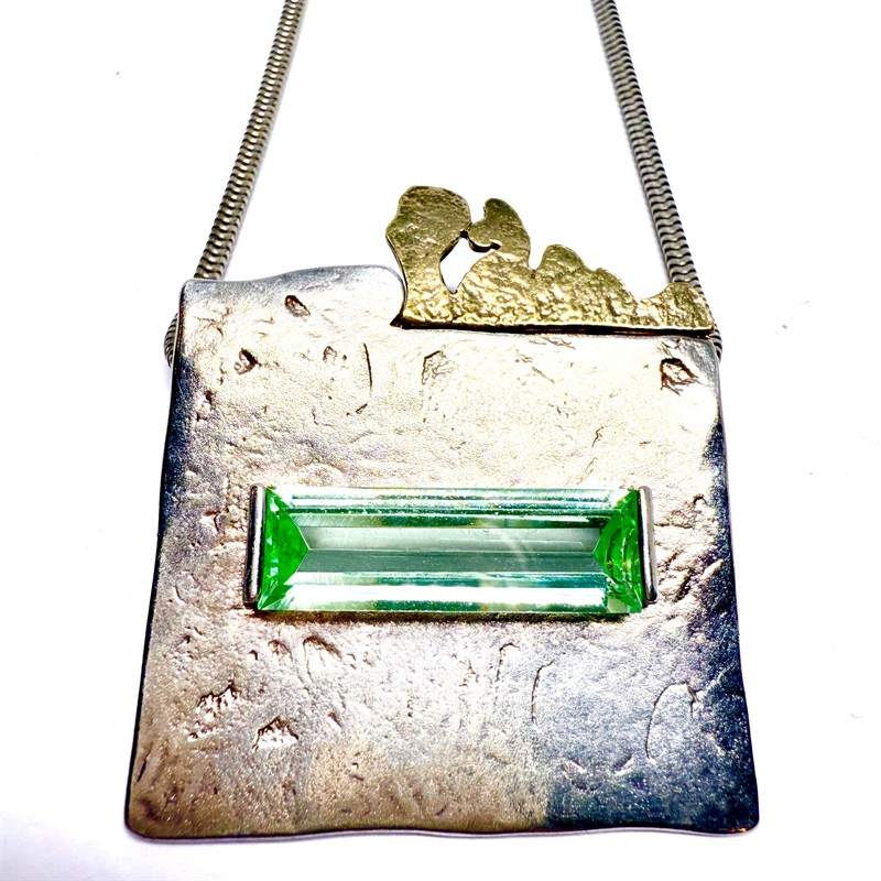 Oridinální, stříbrný náhrdelník. Šperk zdobí modrozelený spinel. Celkový, nevšední dojem utváří zlacená aplikace. Náhrdelník byl vyroben ze sterlingového stříbra (925/1000), o celkové váze 34,84 g. Délka řetízku 46 cm. Rozměr nevšedního závěsu 4 x 3,5 cm. Ateliérový šperk v perfektním stavu.