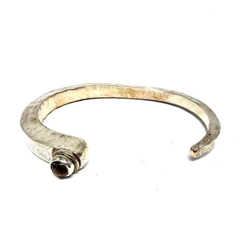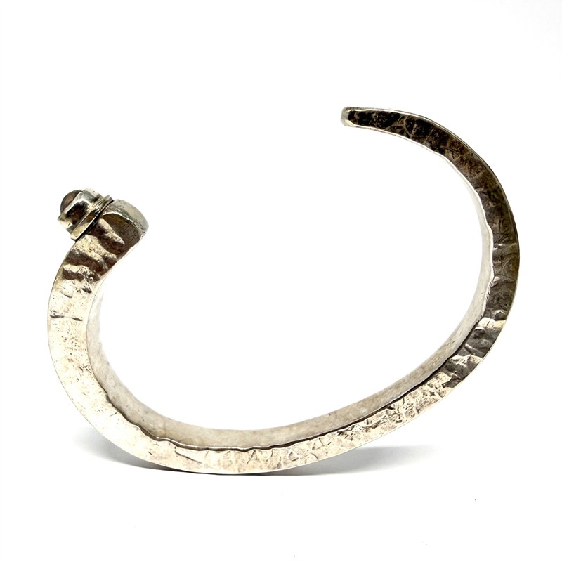 Velmi nevšední stříbrný náramek. Šperk byl zhotoven ze stříbra sterlingové ryzosti 925/1000 a váží 39,84 g. Celý povrch je zdoben výrazným tepáním. Šperk je osazen kulatým etiopským opálem. Průměr 6 cm. Náramek je vhodný spíše na subtilnější zápěstí. Profesionálně vyčištěno. Perfektní stav.
